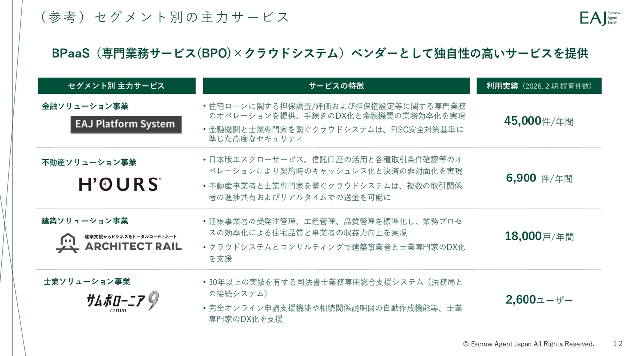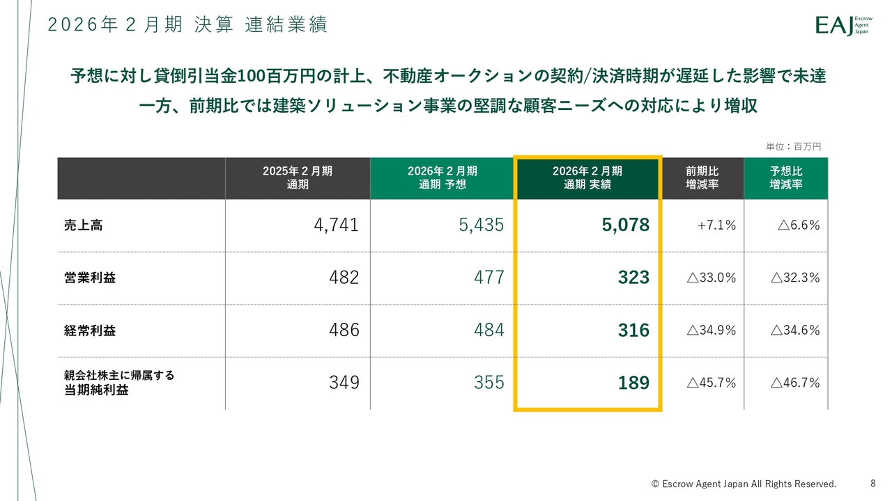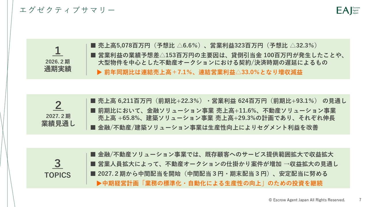 成宮正一郎氏:みなさま、こんにちは。株式会社エスクロー・エージェント・ジャパン代表取締役社長の成宮正一郎です。2026年2月期通期決算説明動画をご視聴いただき、誠にありがとうございます。日頃より当社グループへのご理解とご支援を賜っている株主・投資家のみなさまに、心より御礼申し上げます。