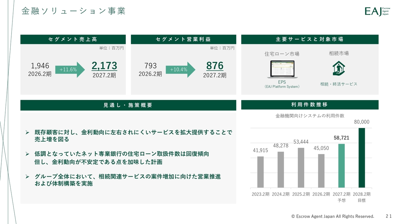 売上高は前期比11.6パーセント増の21億7,300万円、セグメント営業利益は前期比10.4パーセント増の8億7,600万円を見込んでいます。既存顧客に対し、これまでのノウハウを活用したサービス拡大を進めることで、金利動向に左右されにくい収益基盤の構築を図ります。