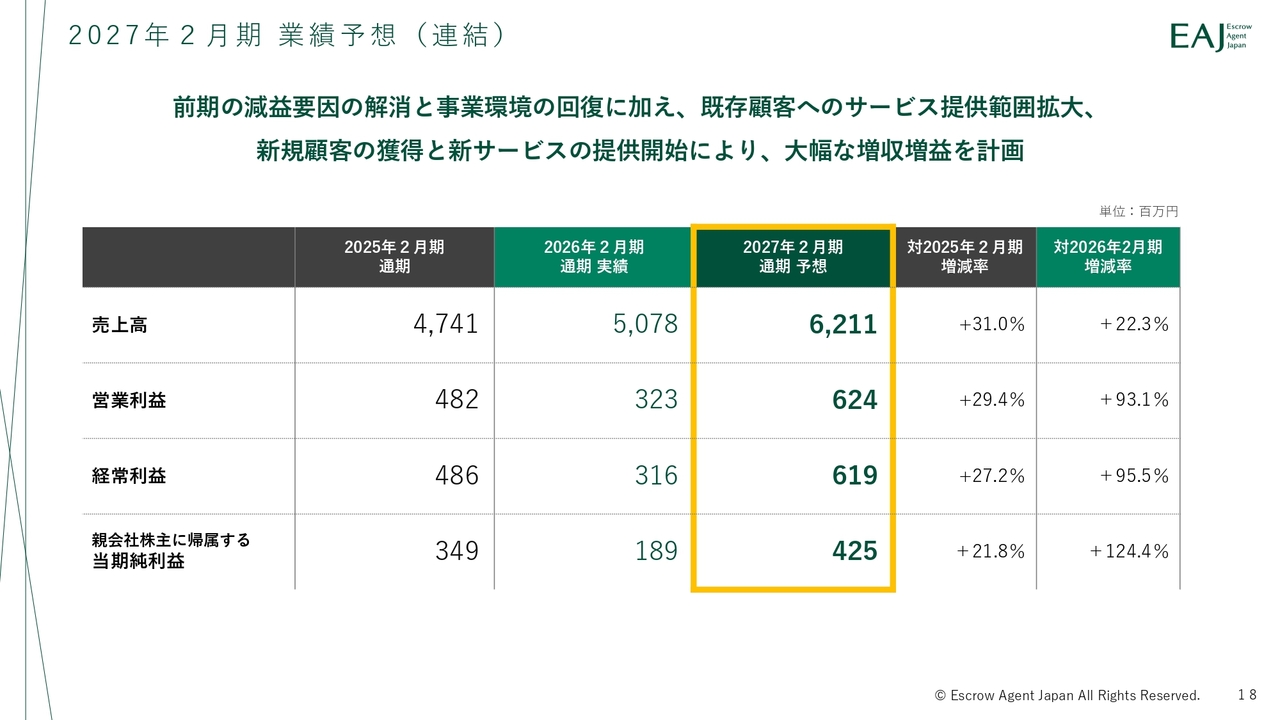 EAJ(エスクロAJ)、既存顧客へのサービス提供範囲拡大や新規顧客獲得により2027年2月期は増収増益を計画