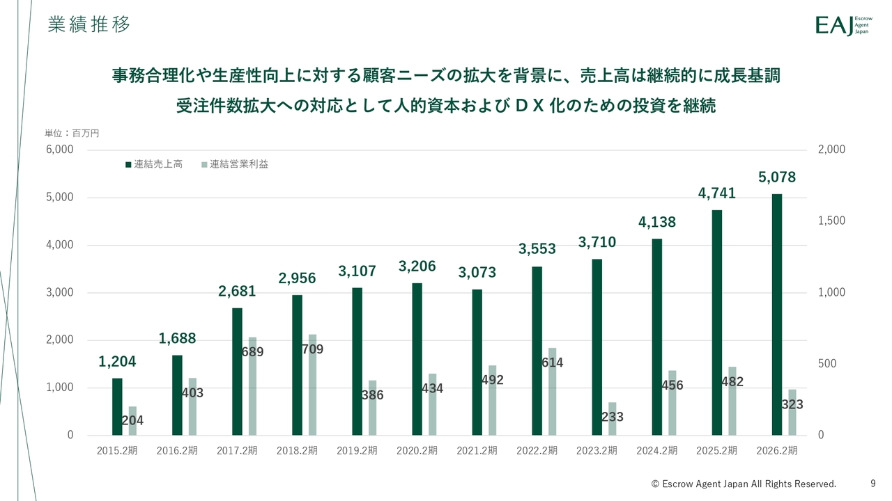売上高は継続して成長しており、顧客の事務合理化ニーズの拡大を背景に事業が拡大しています。将来の成長に向けた人的資本およびデジタルトランスフォーメーション(DX)への投資を継続し、中長期的な収益拡大に向けた基盤構築を進めています。