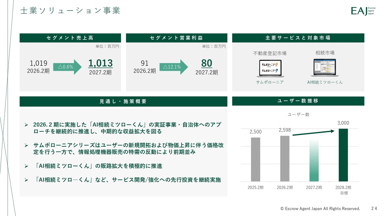 士業分野では、「AI相続ミツローくん」を中心に販路拡大を進めます。「サムポローニアシリーズ」についても、価格改定の検討や新規顧客の開拓を進めていきます。中長期的には、AIを活用したサービス強化により収益拡大を目指します。