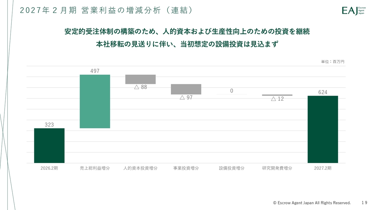 営業利益の増加要因として、売上総利益が4億9,700万円増加しており、そのうち6割を不動産ソリューション事業が占めています。一方、人的資本投資や事業投資を引き続き実施し、成長に向けた先行投資を継続していきます。