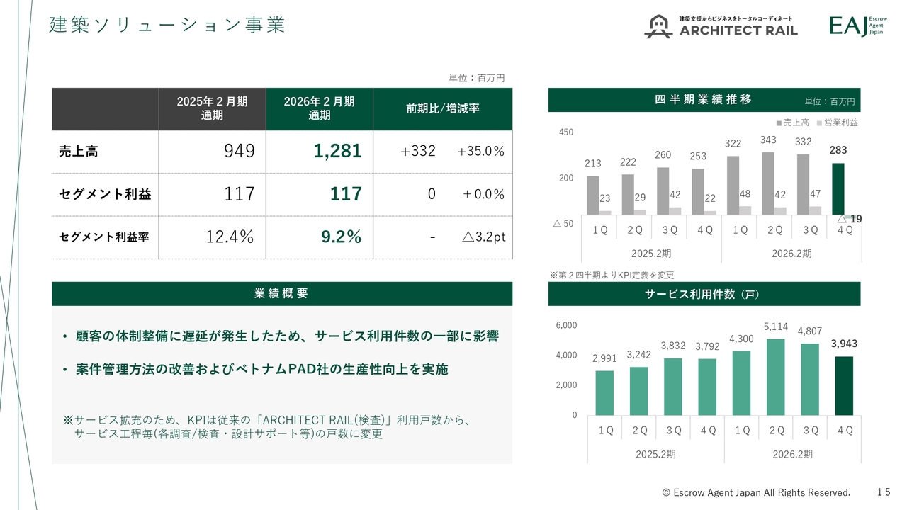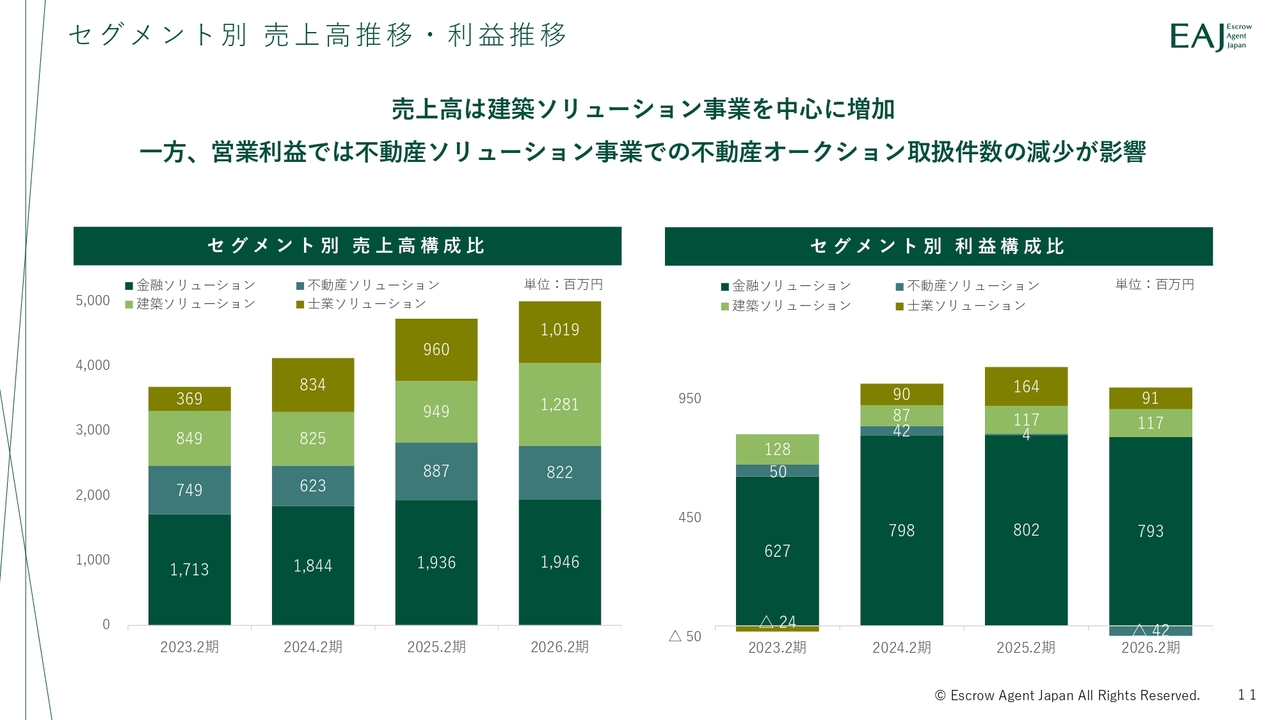 セグメント別では、建築ソリューション事業が成長を牽引し、売上全体の増収に寄与しました。利益面では、不動産ソリューション事業における不動産オークション取引の遅延により、利益が圧迫されました。