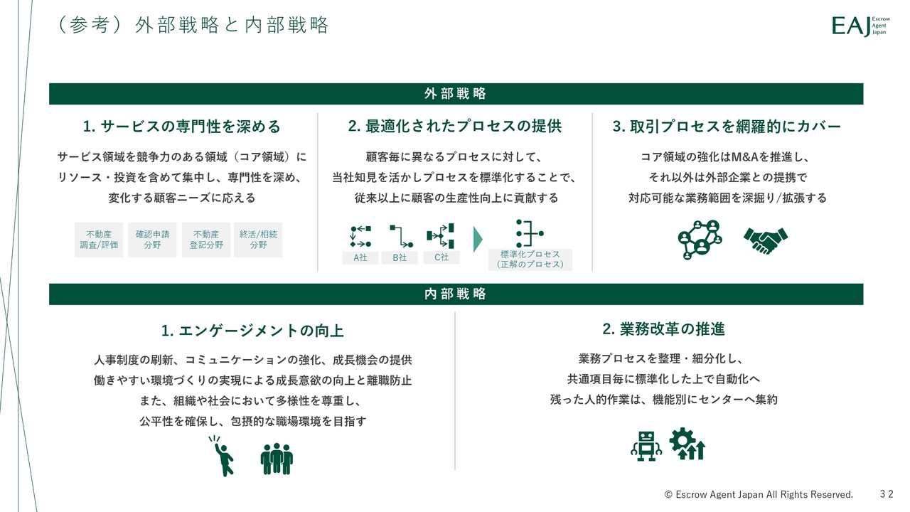外部戦略と内部戦略の両面から、事業の拡大と基盤強化を推進しています。