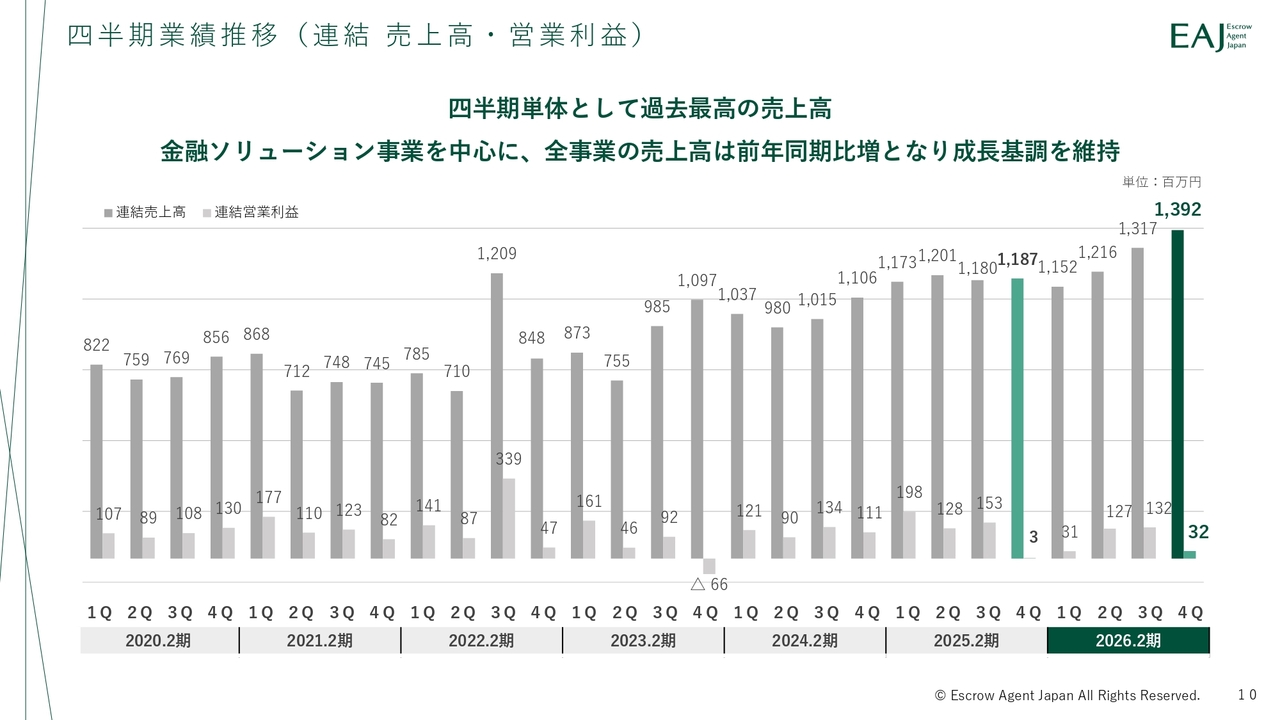 四半期ベースでは、売上高が過去最高水準を更新し、全体として堅調に推移しています。利益については、四半期ごとに変動がありますが、事業の進捗や投資の状況を反映したものです。