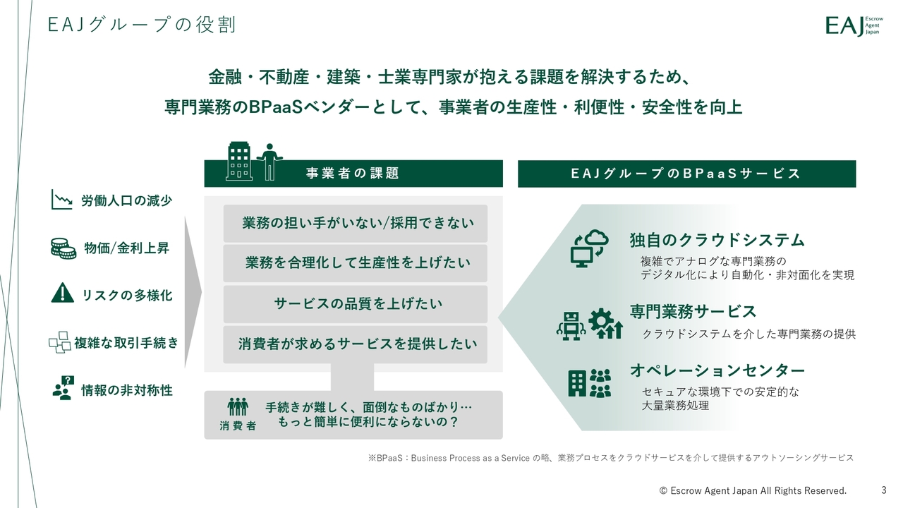当社グループは、金融・不動産・建築・士業といった専門分野の課題に対し、BPaaS(Business Process as a Service)という仕組みを通じて解決策を提供しています。