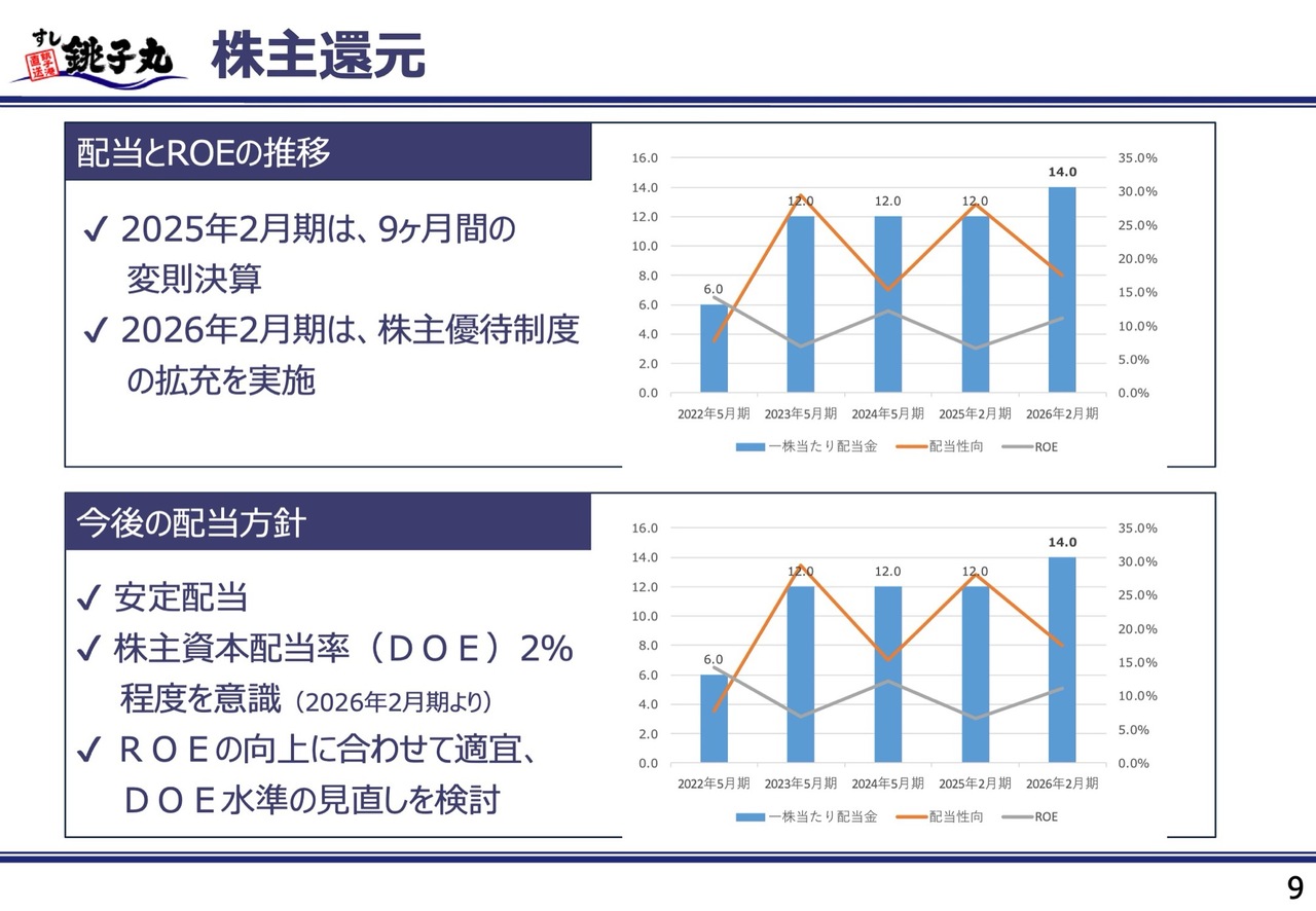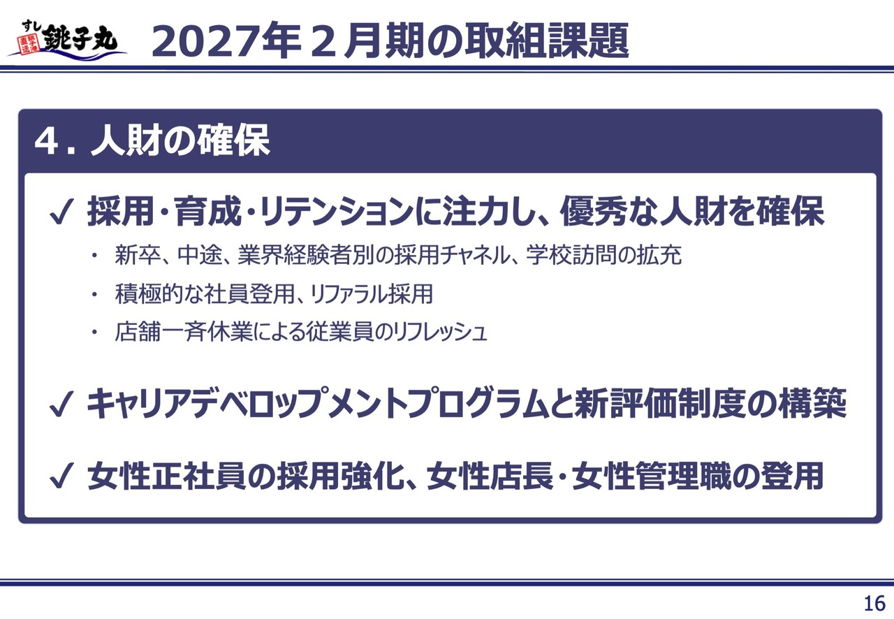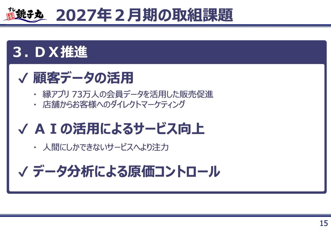 マーケティング戦略に関しては、ブランド認知向上のためにギネス記録達成やテレビCMの放映などの活動を継続し、新規顧客の獲得につなげていきます。お客さまが銚子丸に求めるものを深掘りし、ターゲットに合った企画イベントを実施していきたいと考えています。