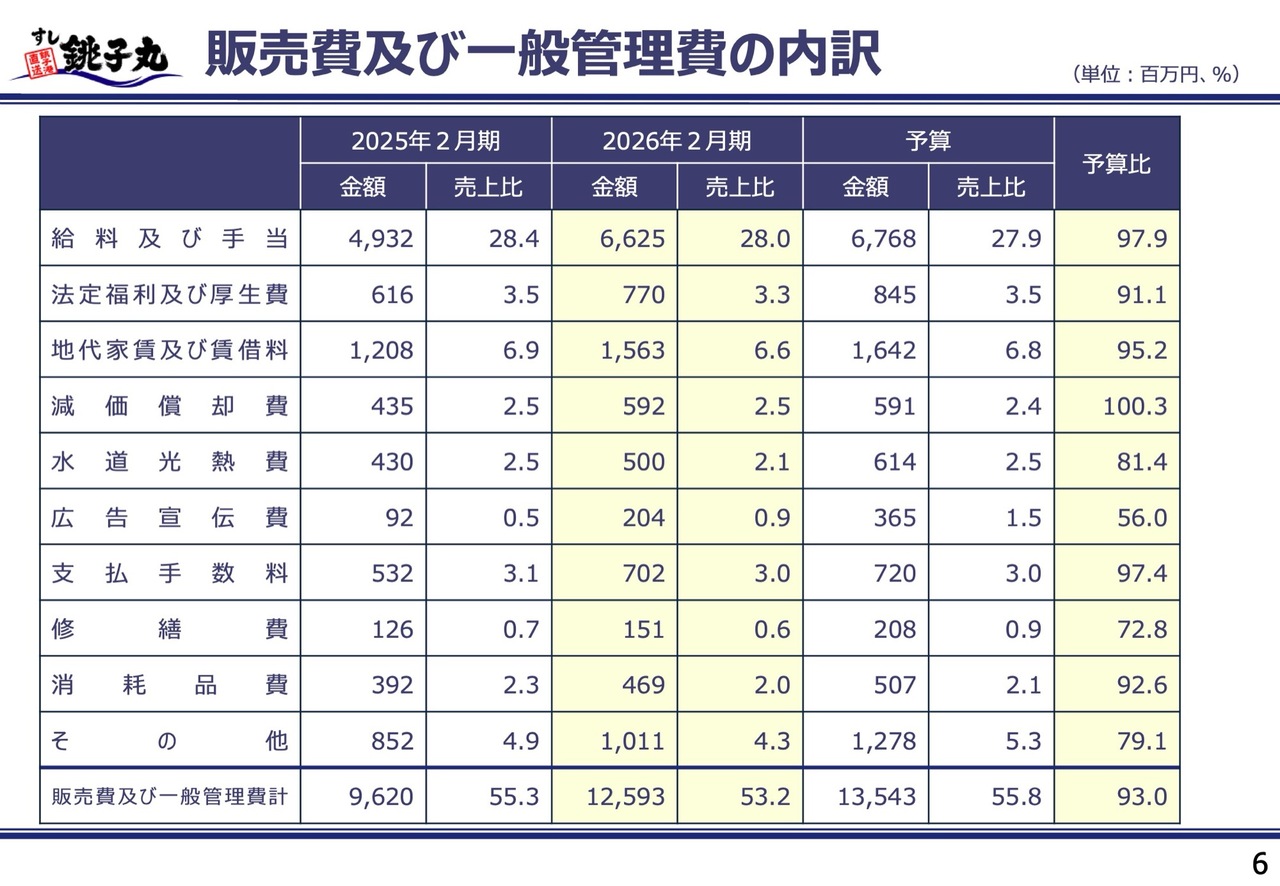 販管費合計の予算比は93.0パーセントで、予算に対して9億5,000万円のマイナスとなりました。上期の売上高減少や原材料費の高騰を受け、年間で2回社内の管理予算を見直し、広告宣伝費や販売促進費、水道光熱費をはじめとする各種経費の圧縮を実施しました。