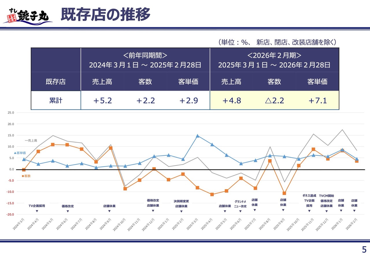 既存店の推移についてです。スライドの数字は同日同期間で比較したもので、新店・閉店および改装店舗を除外した、純粋既存店の推移を示しています。通期累計では、売上高がプラス4.8パーセント、客数がマイナス2.2パーセント、客単価がプラス7.1パーセントとなりました。