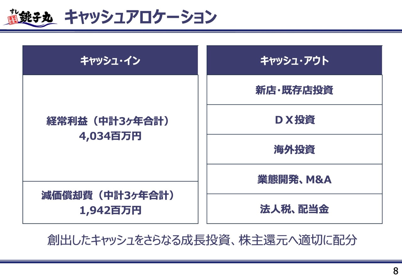 このキャッシュを、新規出店、既存店の改装、DX投資、海外投資、新業態開発、M&Aなどにバランスよく配分し、成長投資を行うとともに、適切な株主還元を進めていきたいと考えています。