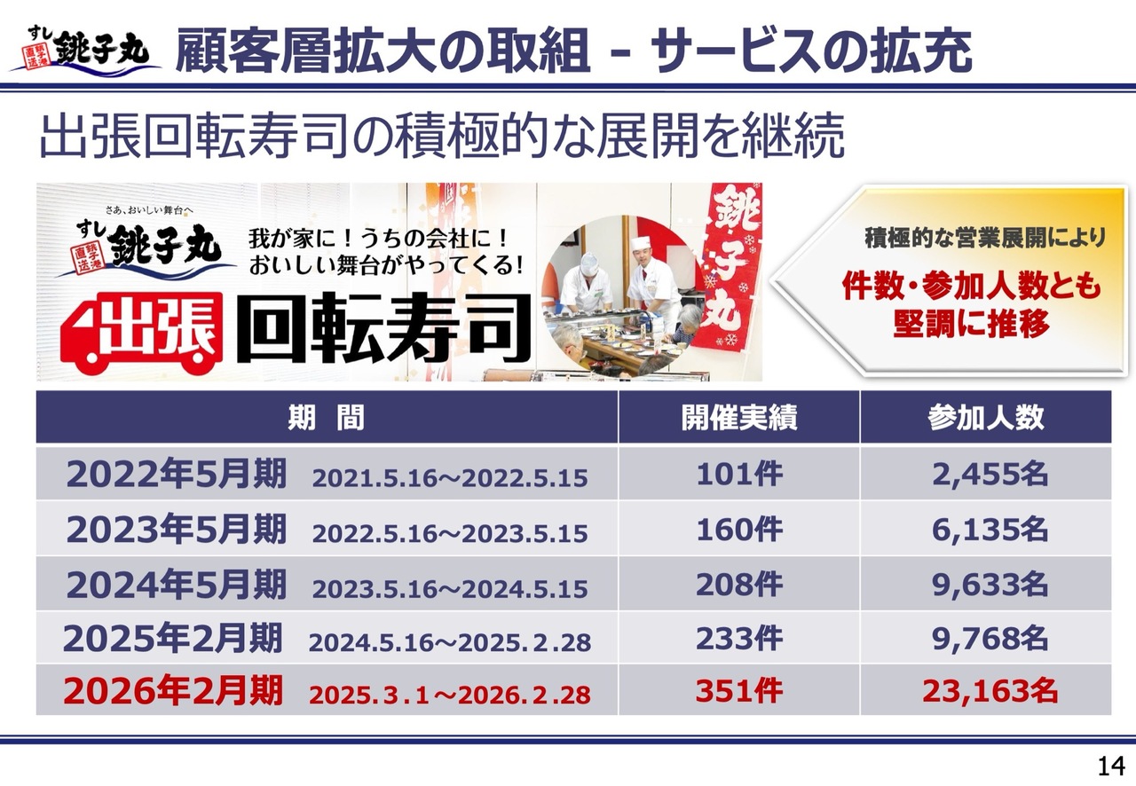 開催件数および参加人数は年々増加しており、法人や個人のお客さまからのリピートも着実に増えています。店舗へのご来店や外食が難しい老人ホームからの出張ニーズも多く、社会的貢献を意識しながら、引き続き事業拡大を目指します。