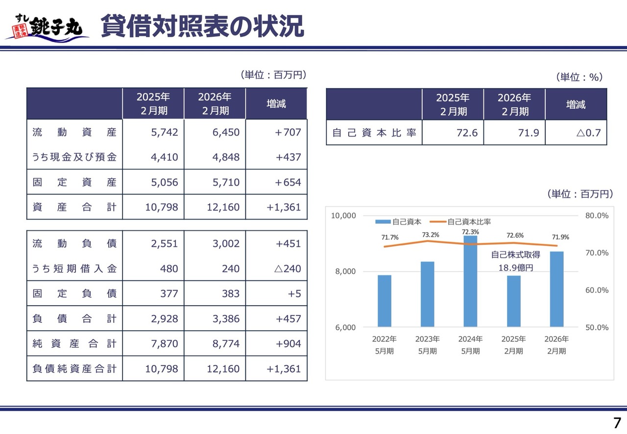 B/Sの状況です。前期は、2025年1月に自己株式を18億9,200万円で取得しました。当期の自己資本比率は71.9パーセントと、引き続き高水準で推移しています。