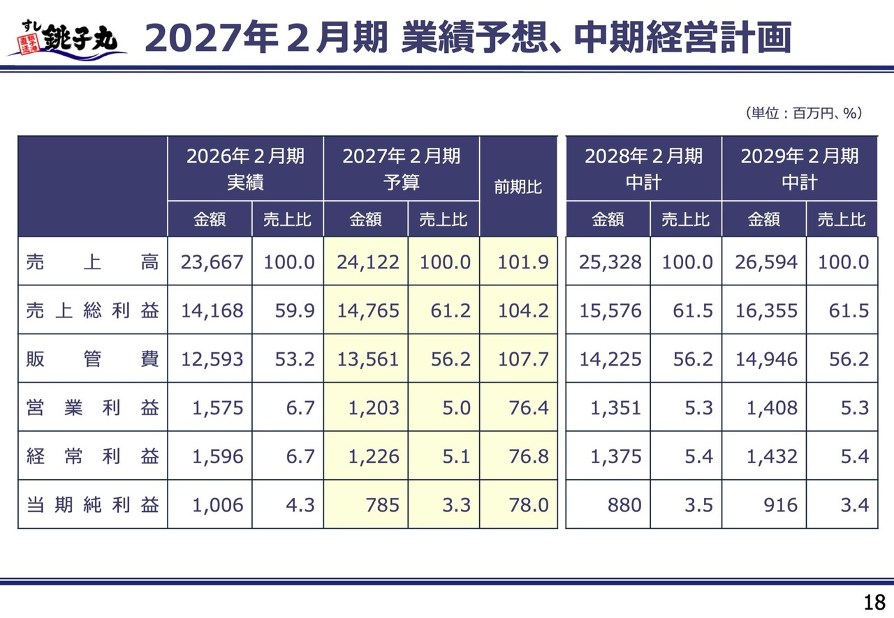 2027年2月期の業績予想と中期経営計画についてご説明します。先ほどお伝えしたさまざまな取り組みにより、2027年2月期の売上高予算は前期比101.9パーセントの241億2,200万円と計画しています。