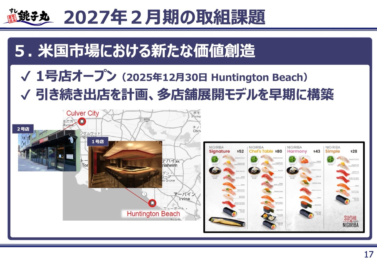 米国合弁会社において、寿司を軸とした業態開発を推進しています。昨年12月に、米国1号店である「SUSHI NIGIRIBA」をカリフォルニア州ハンティントンビーチにオープンし、本年3月にはカルバーシティに2号店をオープンしました。