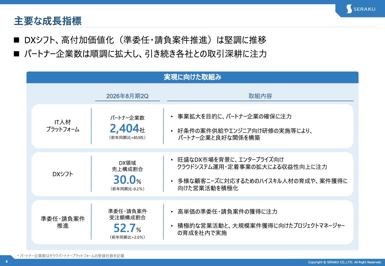 こちらでは主要な成長指標についてご説明します。IT人材プラットフォームに登録されているビジネスパートナーの増加は継続しており、当社案件に対してパートナーエンジニアの参画も着実に増加しています。