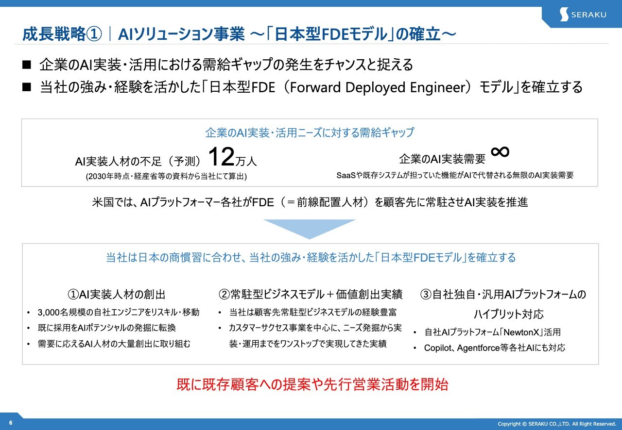 まず、AIソリューション事業への新規参入です。当社の強みを活かし、顧客企業のAI活用の現場に当社のAI実装人材を配置する「日本型FDEモデル」の確立を目指します。