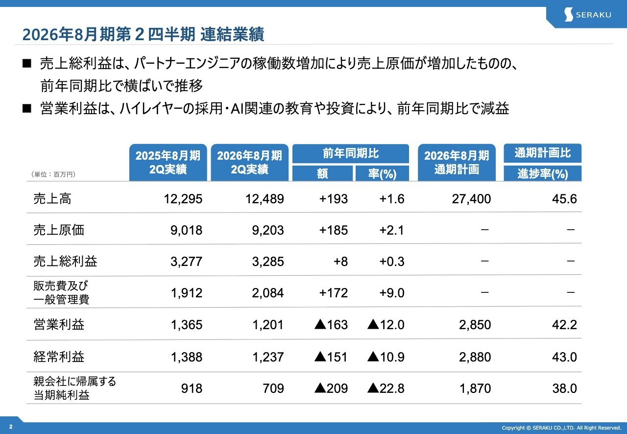 AIアバター:それでは私より、2026年8月期第2四半期の決算概要についてご説明します。