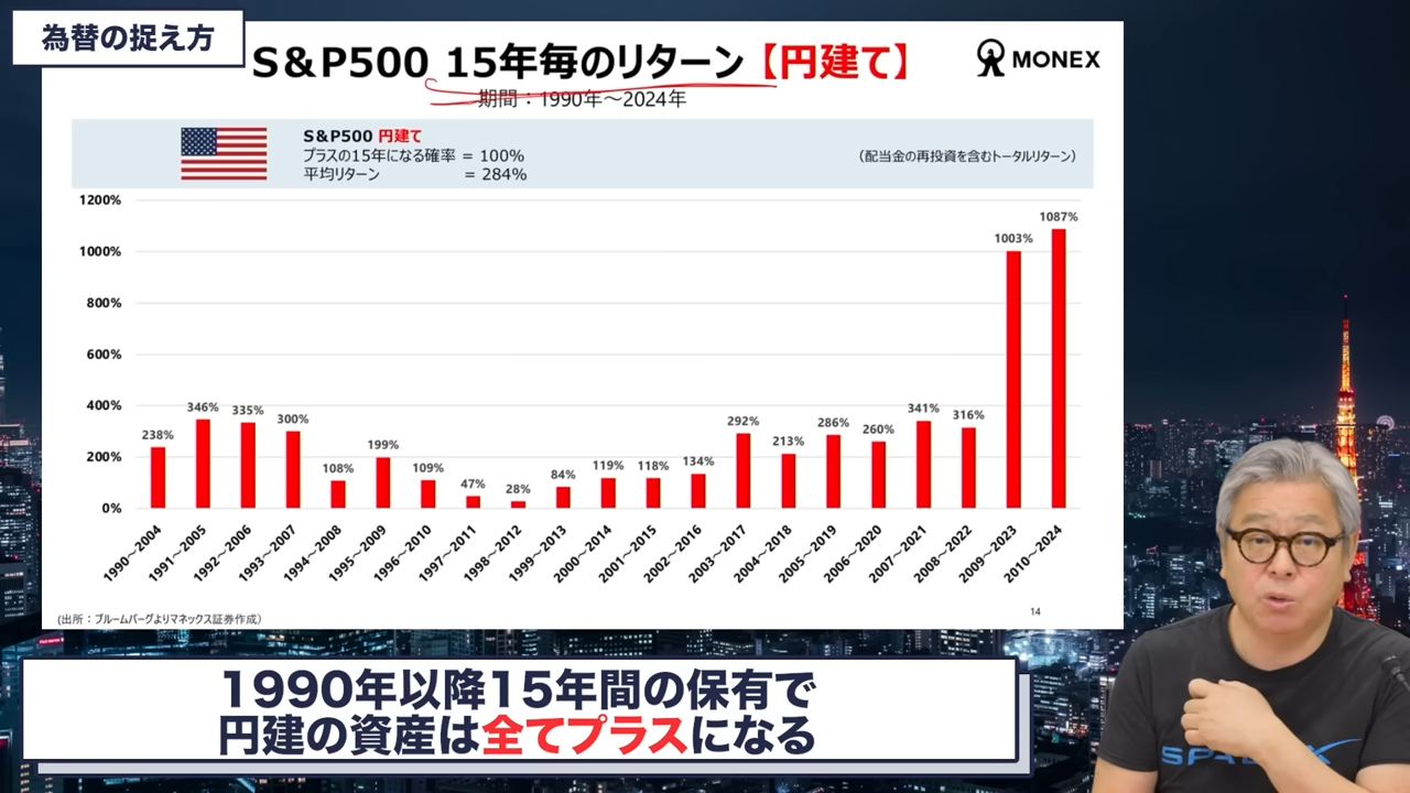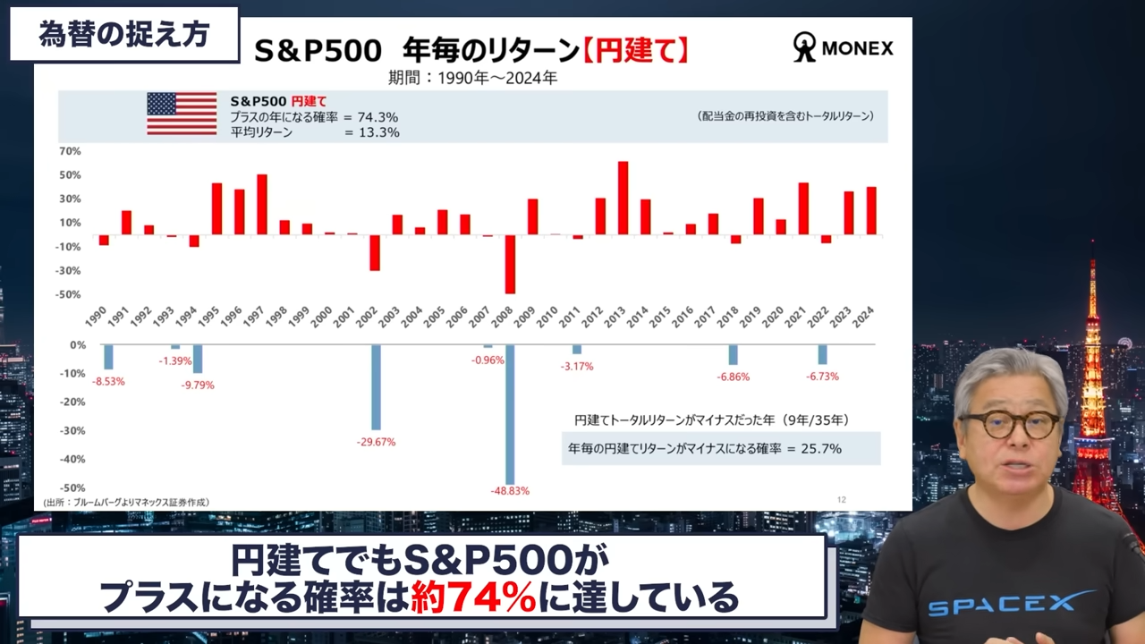 こちらのスライドでは、S&P500の1990年以降の円建てトータルリターンを年次ベースで示しています。まず注目すべきは、円建てでもS&P500がプラスになる確率は約74パーセントに達しているという点です。つまり、4年のうち約3年は、為替込みでも資産が増えているという計算になります。