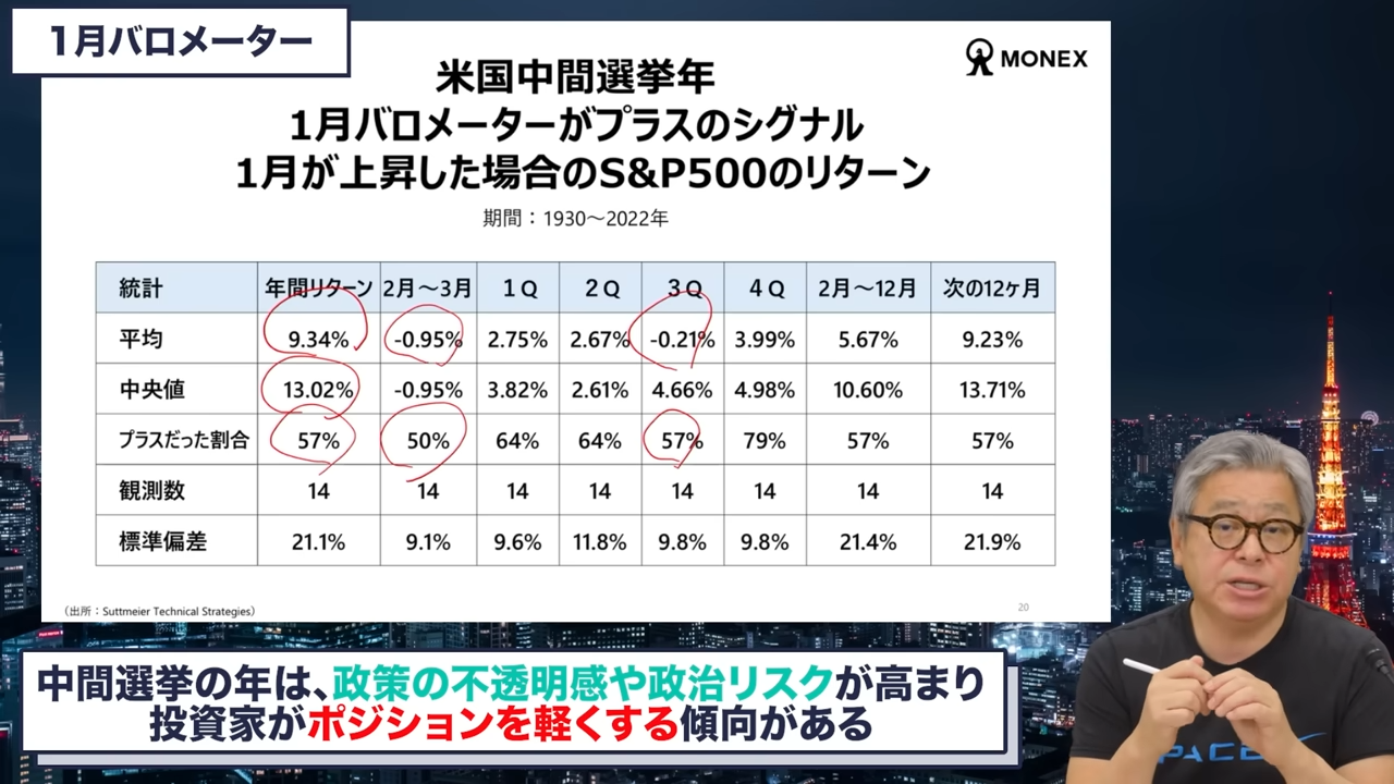 1月が強いと春に調整が起き、初夏には安定し、夏から秋にかけて再び不安定になり、選挙が終わったあとには年末ラリーがやってきます。これが長い米国株の歴史の中で繰り返されてきた、中間選挙の年の典型的なマーケットのリズムなのです。