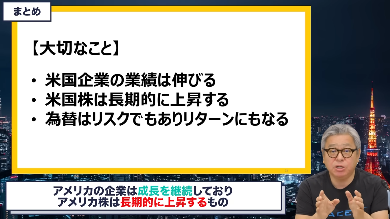 米国の企業は成長を継続しています。米国株は長期的に上昇するものであり、その過程で調整はつきものです。為替はリスクであり、同時にリターンにもなることを覚えておいてください。
