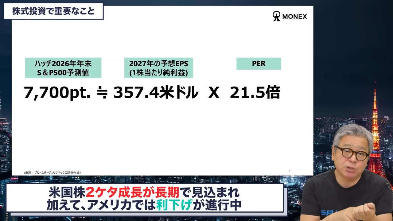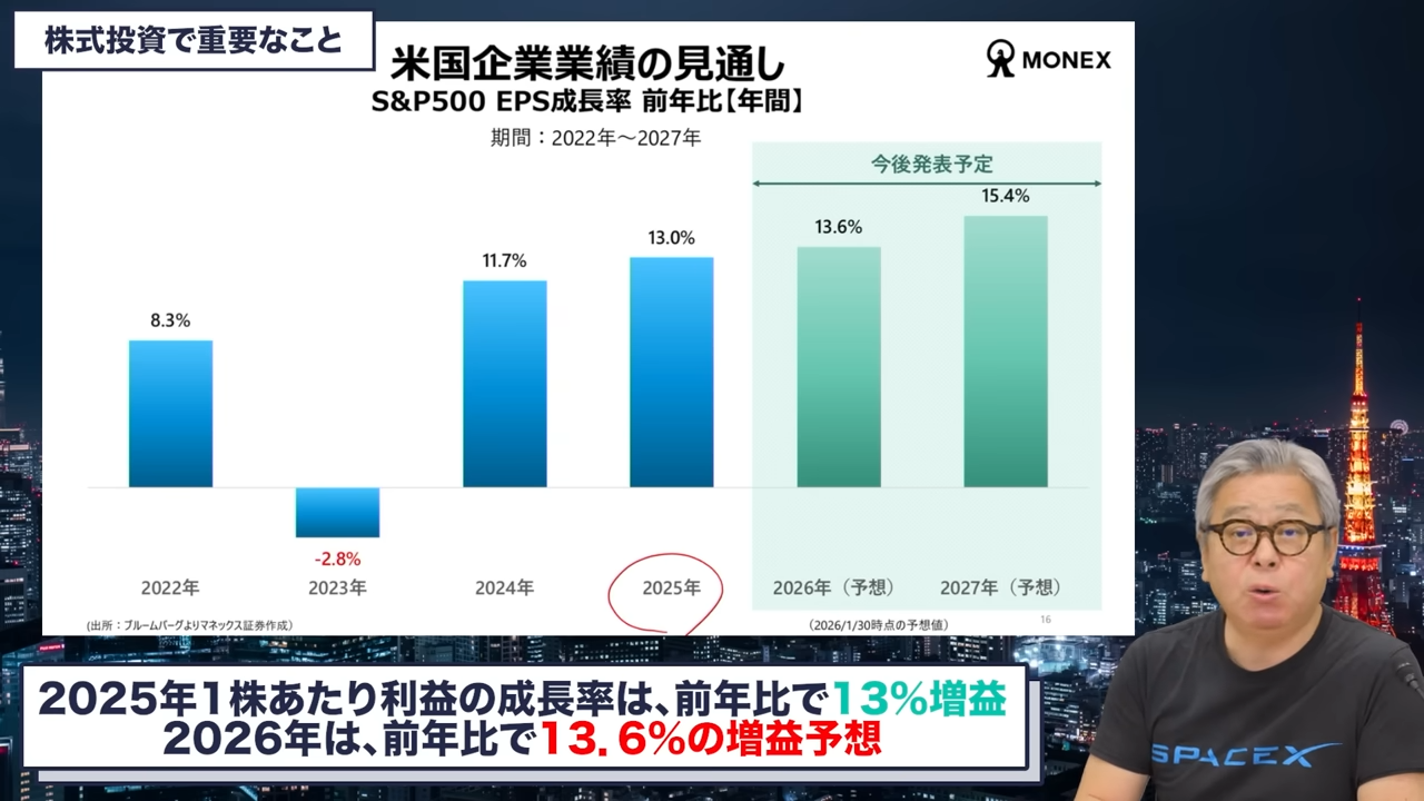 例えば、S&P500のEPS(1株あたりの利益)成長率は、2025年は前年比プラス13パーセントになると予想していますが、2026年は前年比プラス13.6パーセント、2027年は現時点では前年比プラス15.4パーセントで増益予想となっています。