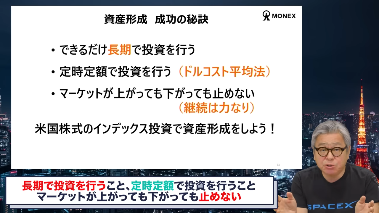 資産形成の成功の秘訣として、毎回お見せしている要点をスライドにまとめています。大切なのは、「できるだけ長期で投資を行うこと」「定時、定額で投資を行うこと」「マーケットが上がっても下がっても投資を止めないこと」です。特に下がったときに、止めてはいけません。