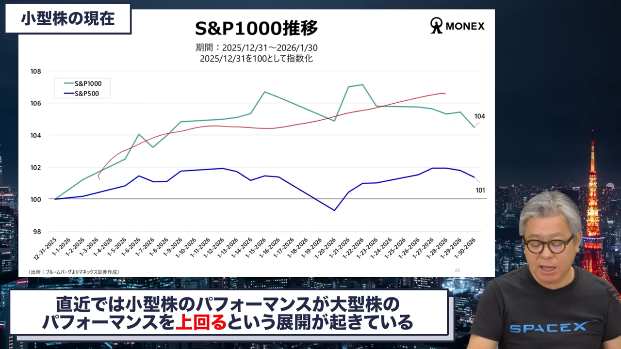 ところが最近、この構図に変化が起きています。昨年末からのS&P500とS&P1000の相対的なパフォーマンスを比較すると、直近ではS&P1000のパフォーマンスがS&P500のパフォーマンスを上回るという展開が見られています。