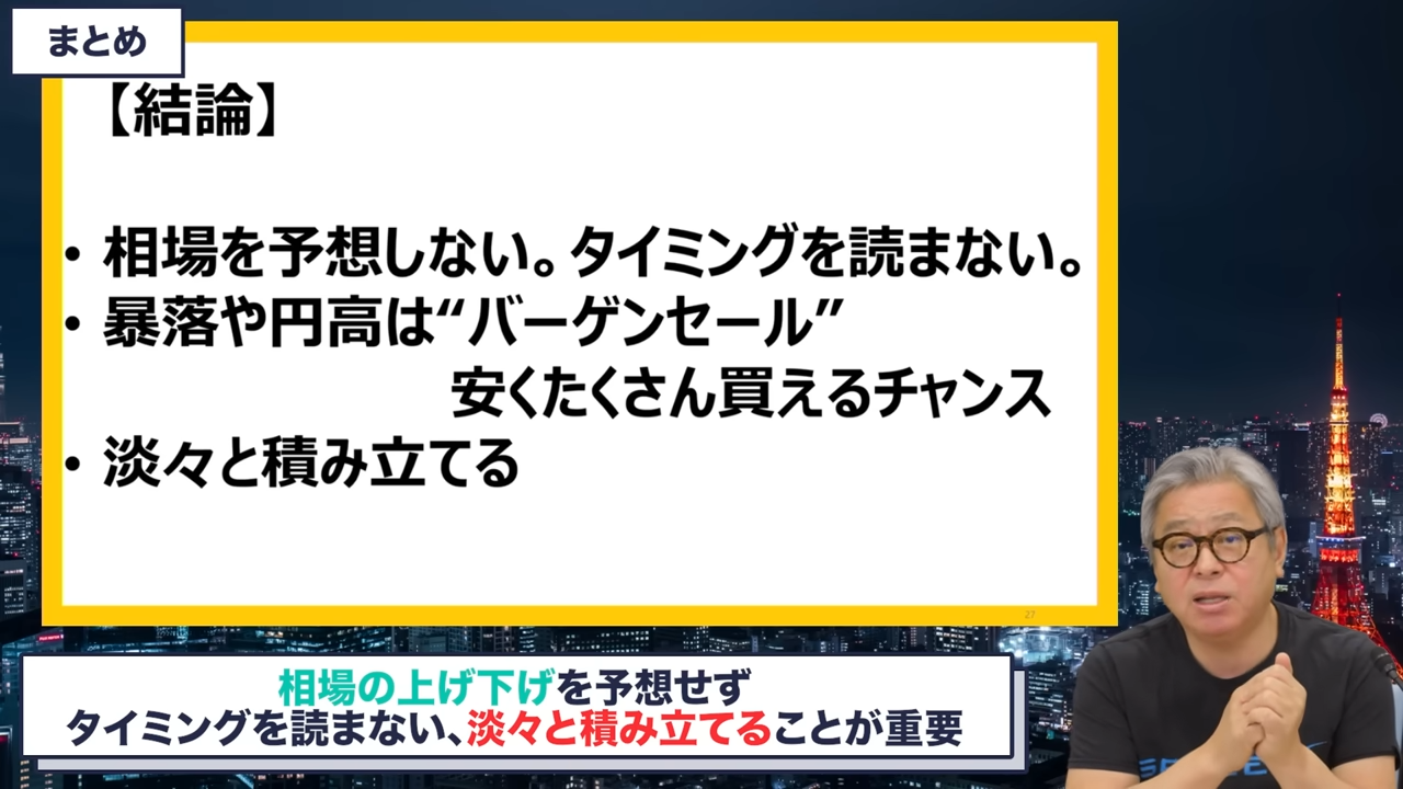 つまり結論はシンプルで、相場の上げ下げを予想しないこと、すなわちタイミングを読まず、淡々と積み立てることが大切です。暴落や円高は安くたくさん買える「株のバーゲンセール」だと思ってください。