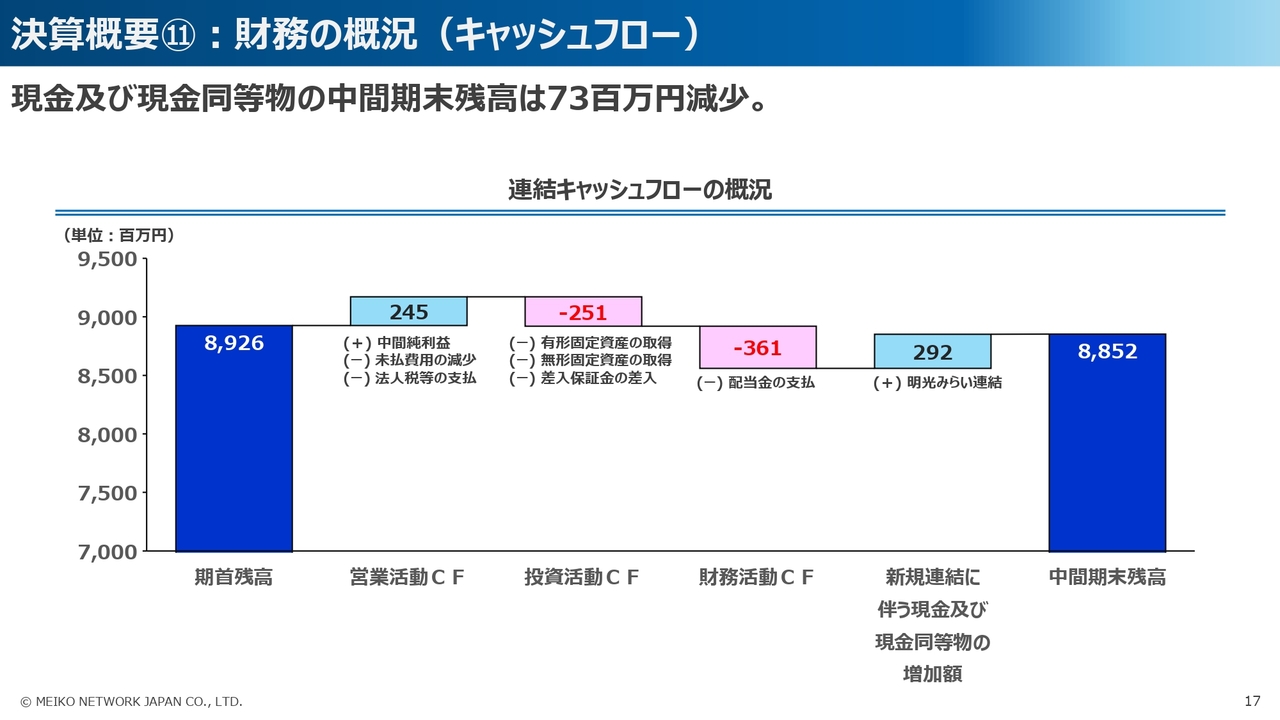 このほか、明光みらいの新規連結による現金及び現金同等物の増加を含めて、現金及び現金同等物の中間期末残高は7,300万円減少し、88億5,200万円となりました。