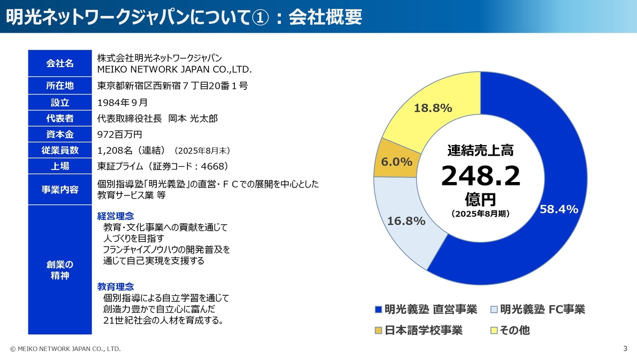 岡本光太郎氏:本日はお忙しい中、株式会社明光ネットワークジャパンの2026年8月期第2四半期決算説明会にご出席いただき、誠にありがとうございます。代表取締役社長の岡本光太郎です。どうぞよろしくお願い申し上げます。