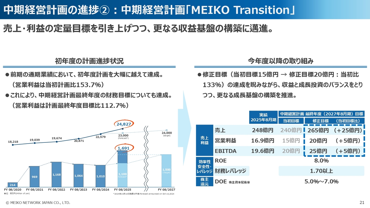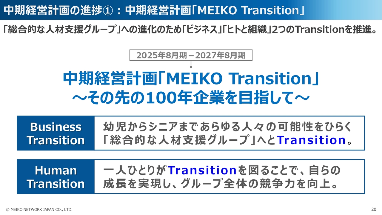 当社グループでは、2025年8月期を初年度とする3ヶ年中期経営計画「MEIKO Transition」を策定しています。