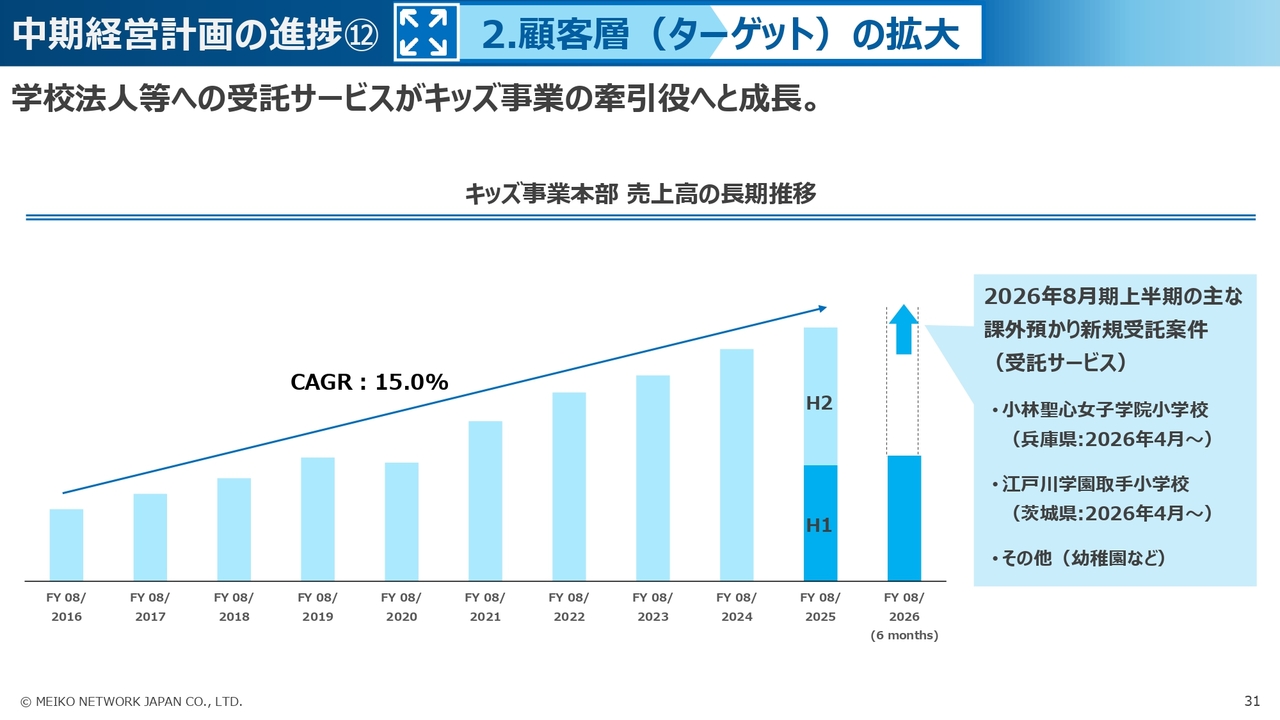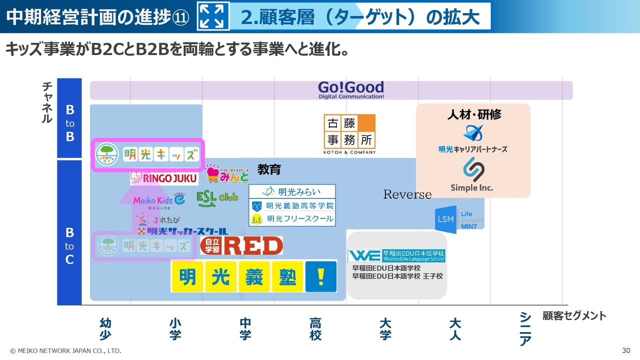 次に、2つ目の「ターゲットの拡大」の切り口としては、キッズ事業において、これまでの直営スクールを中心としたB2C領域から、受託サービスなど、B2B領域が成長しています。