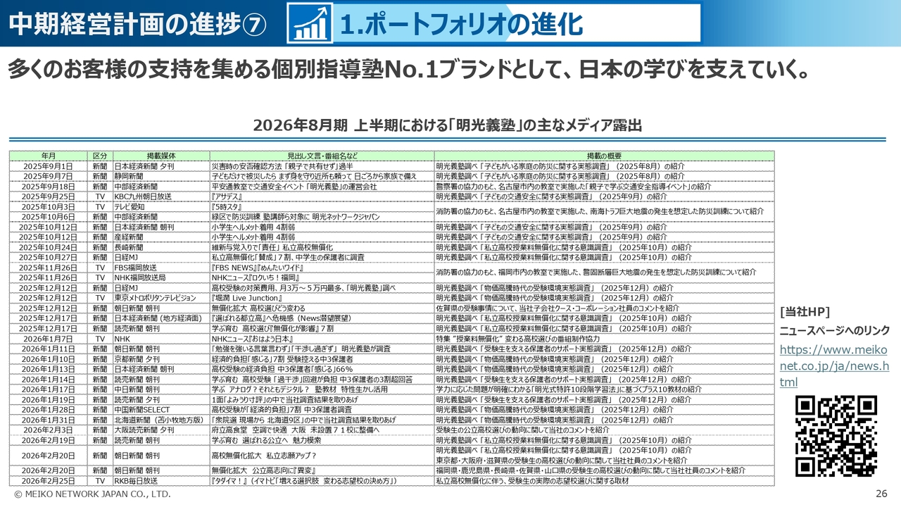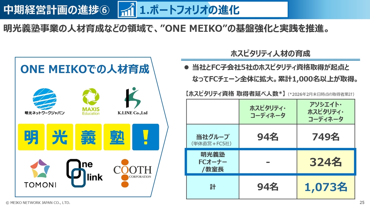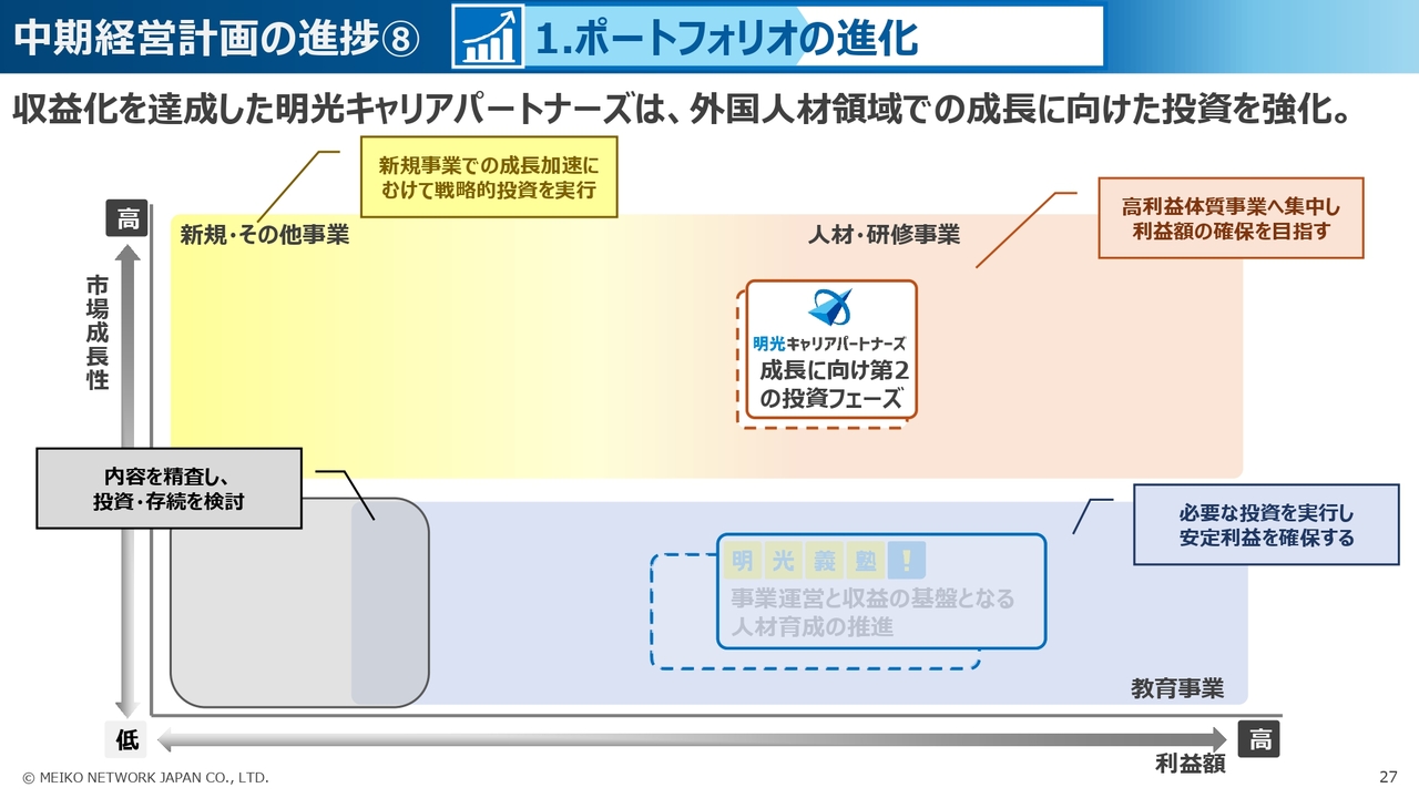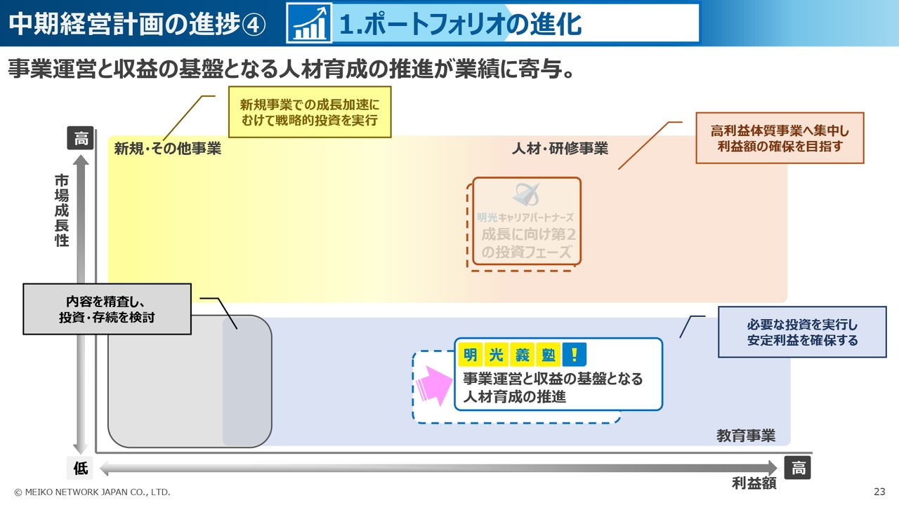 まず、1つ目の「ポートフォリオの進化」では、明光義塾事業において、顧客満足度の高い教室づくりを目指し、事業運営と収益の基盤となる人材の育成について、当社直営グループが一丸となって取り組んできました。