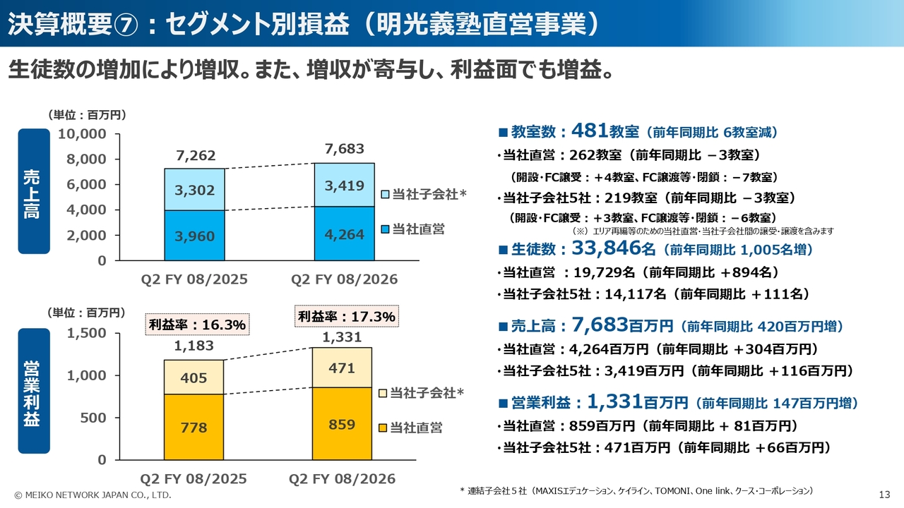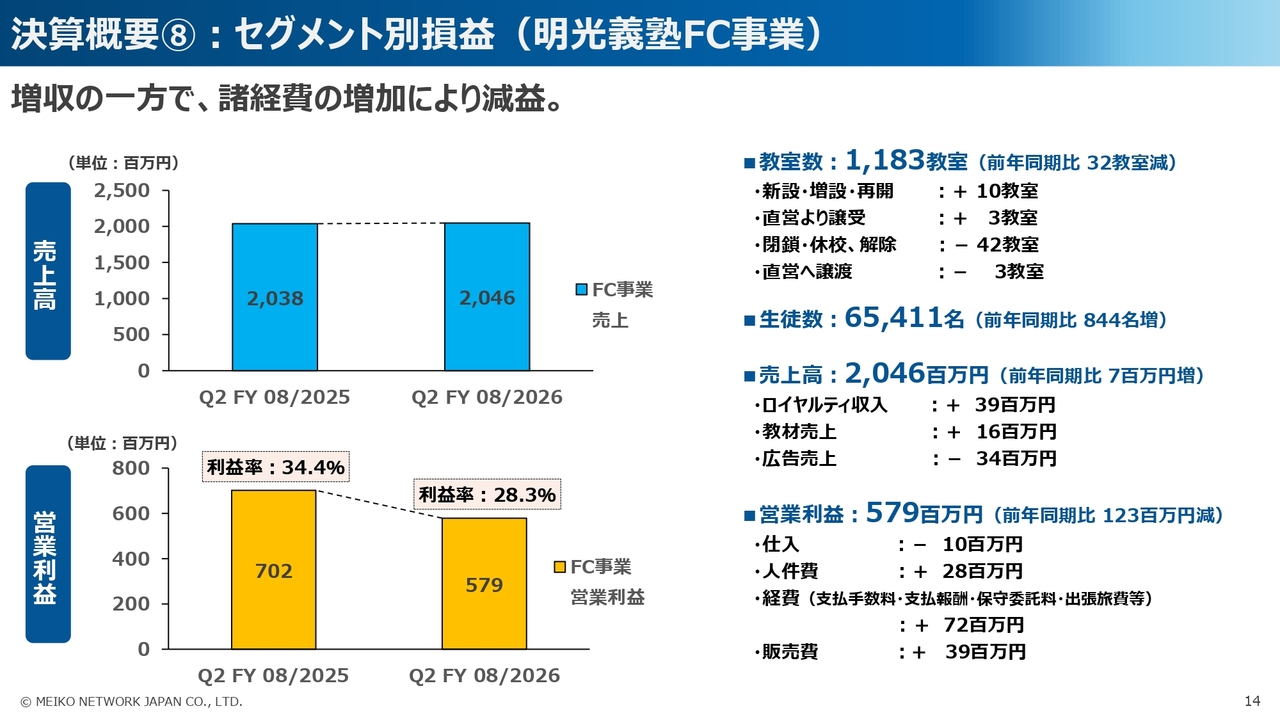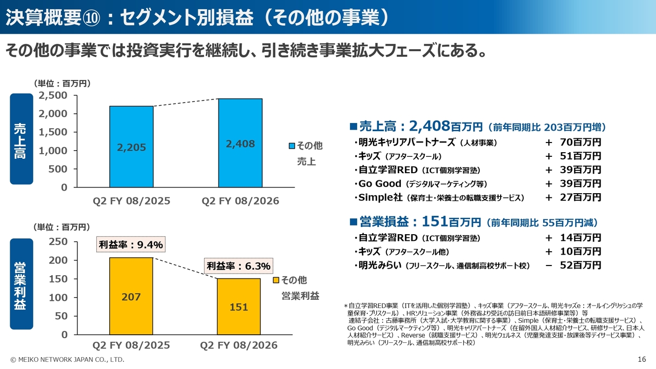 また、セグメント別の営業利益については、明光義塾直営事業と日本語学校事業で前年同期比で増益となりましたが、明光義塾FC事業と、今年度から新たに連結対象となった明光みらいを含むその他の事業では、前年同期比で減益となりました。