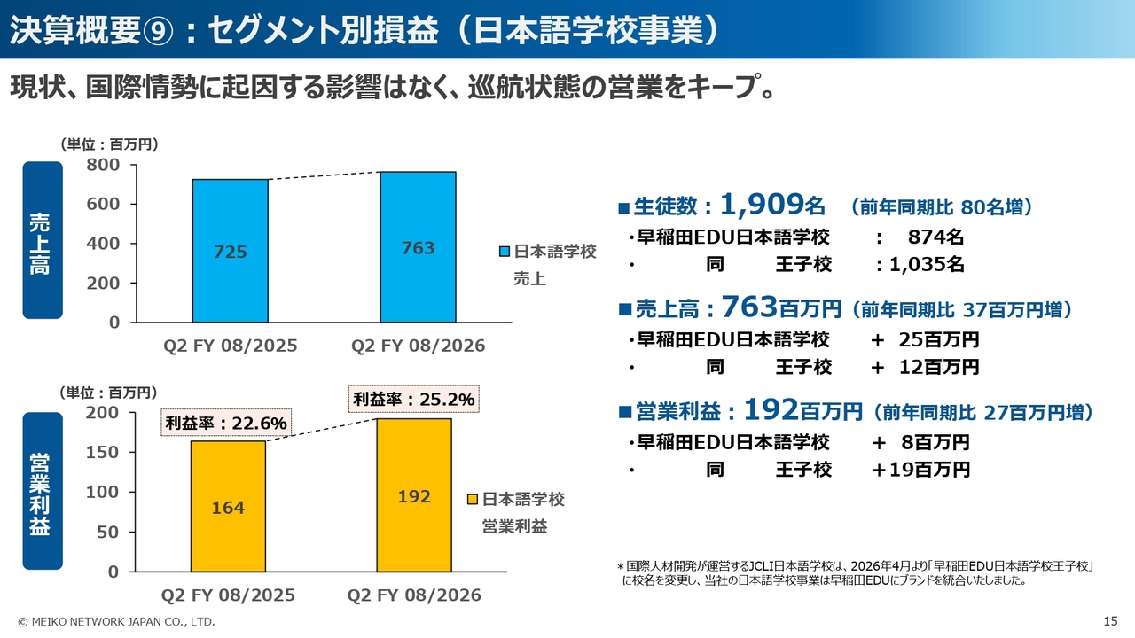 次に、日本語学校事業についてです。懸念された国際情勢に起因した事業への影響はなく、当第2四半期末時点で、在籍生徒数は前年同期比で80名増加の1,909名となっています。
