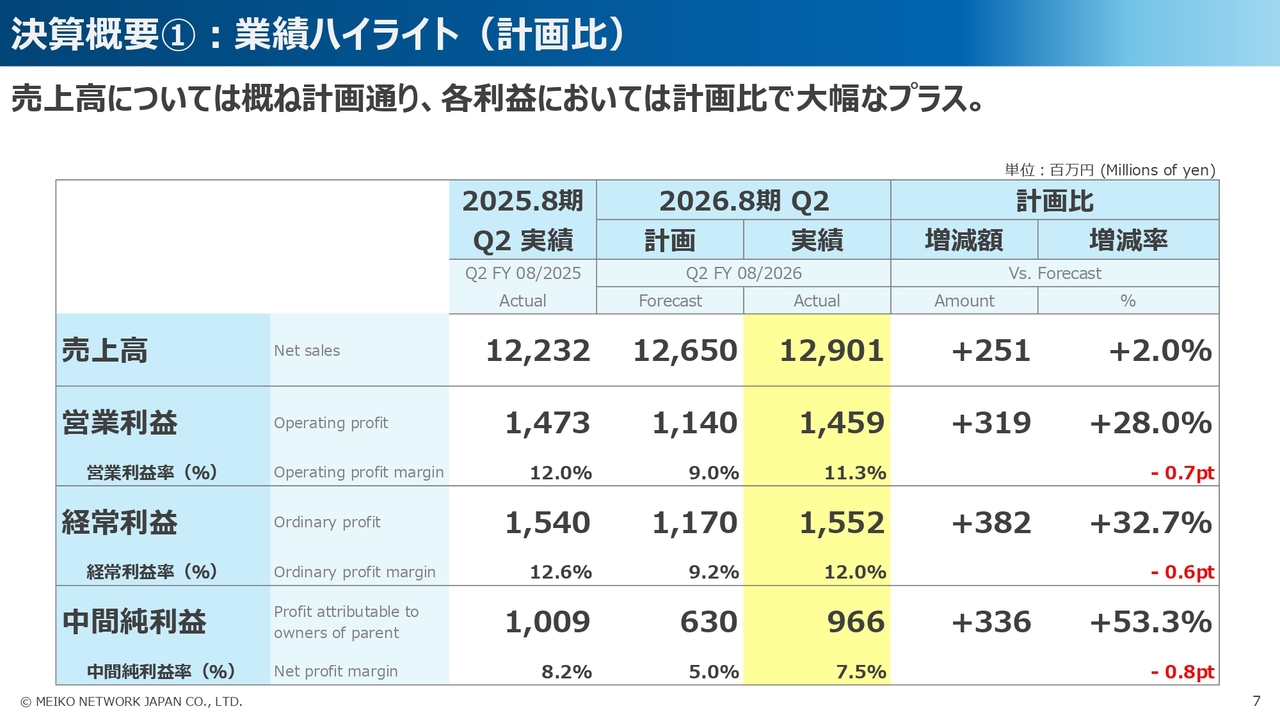 決算概要①:業績ハイライト(計画比)