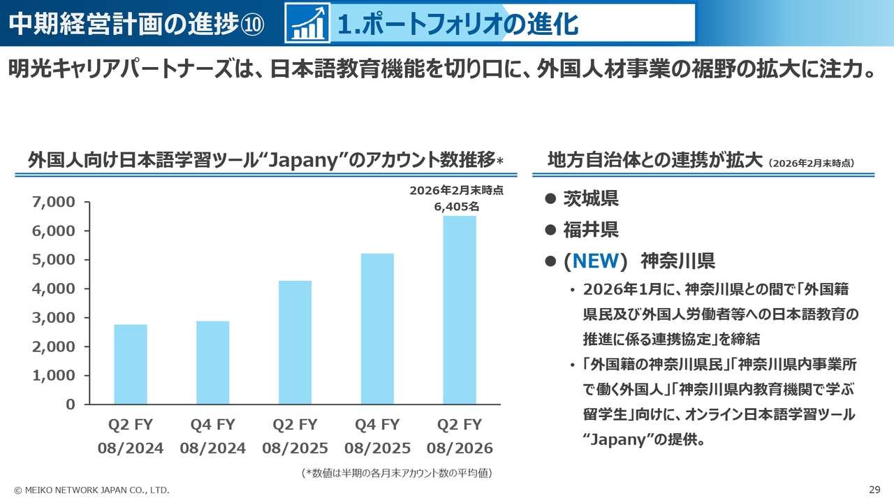 明光キャリアパートナーズの外国人向け研修事業としては、日本語学習ツール「Japany」のユーザー数が6,405名となり、ユーザー数を大幅に増加させているほか、2026年1月には、神奈川県との間で、外国人労働者等への日本語教育の推進に係る連携協定を締結しました。
