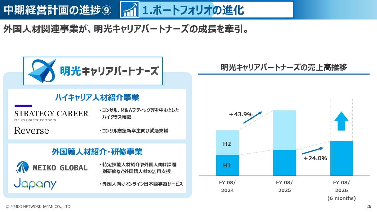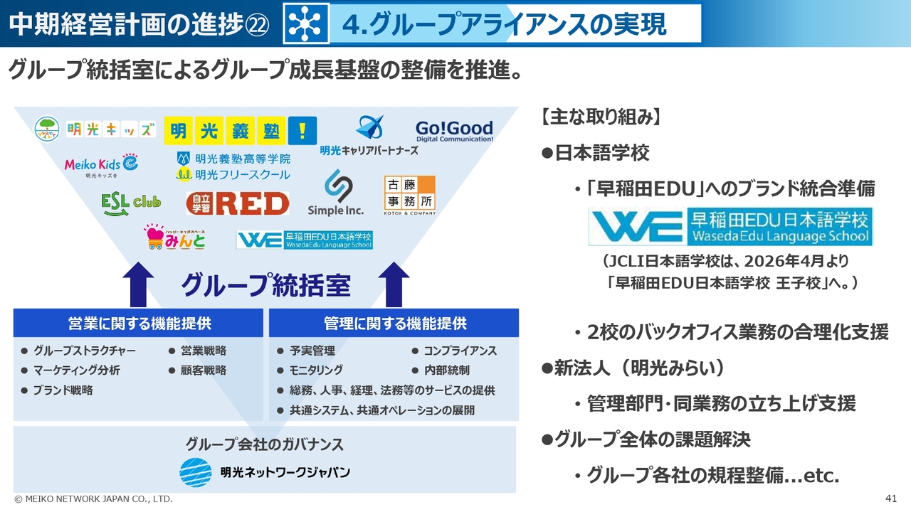 そして、人材・研修の事業領域においては、明光キャリアパートナーズが第2の投資フェーズを迎えており、外国人材などポテンシャルの高いマーケットで成長実現に向けた新たな基盤構築に取り組んでいます。