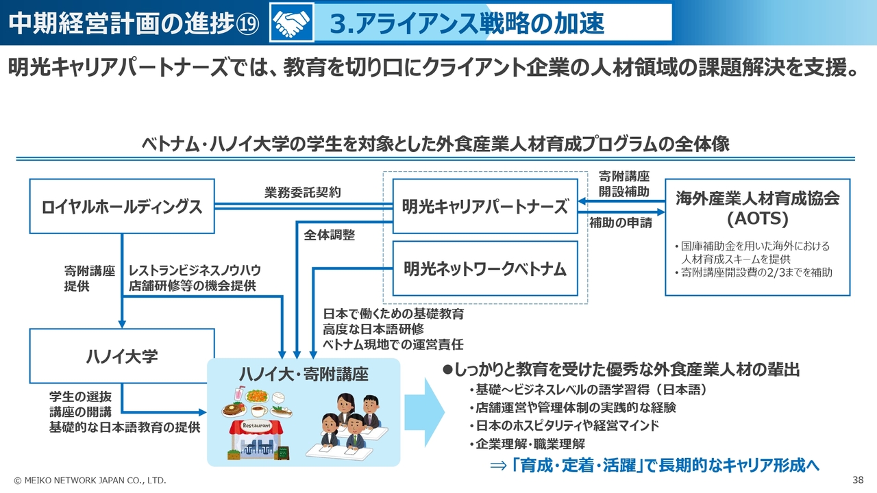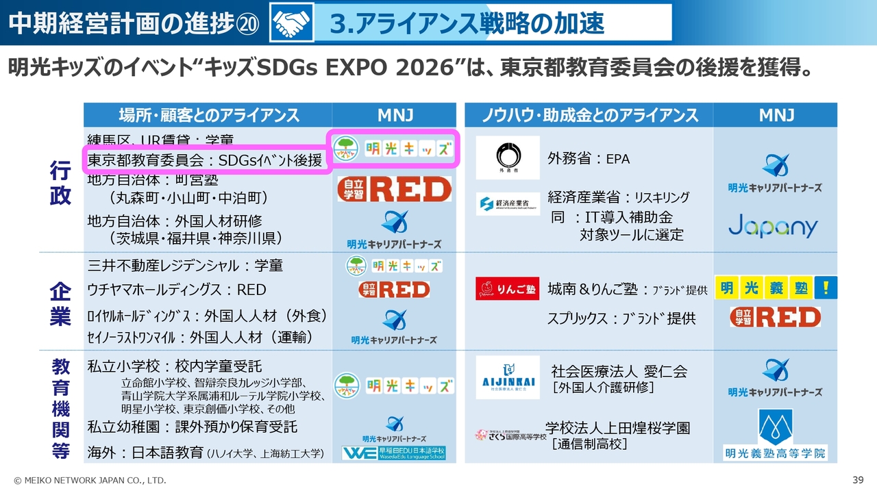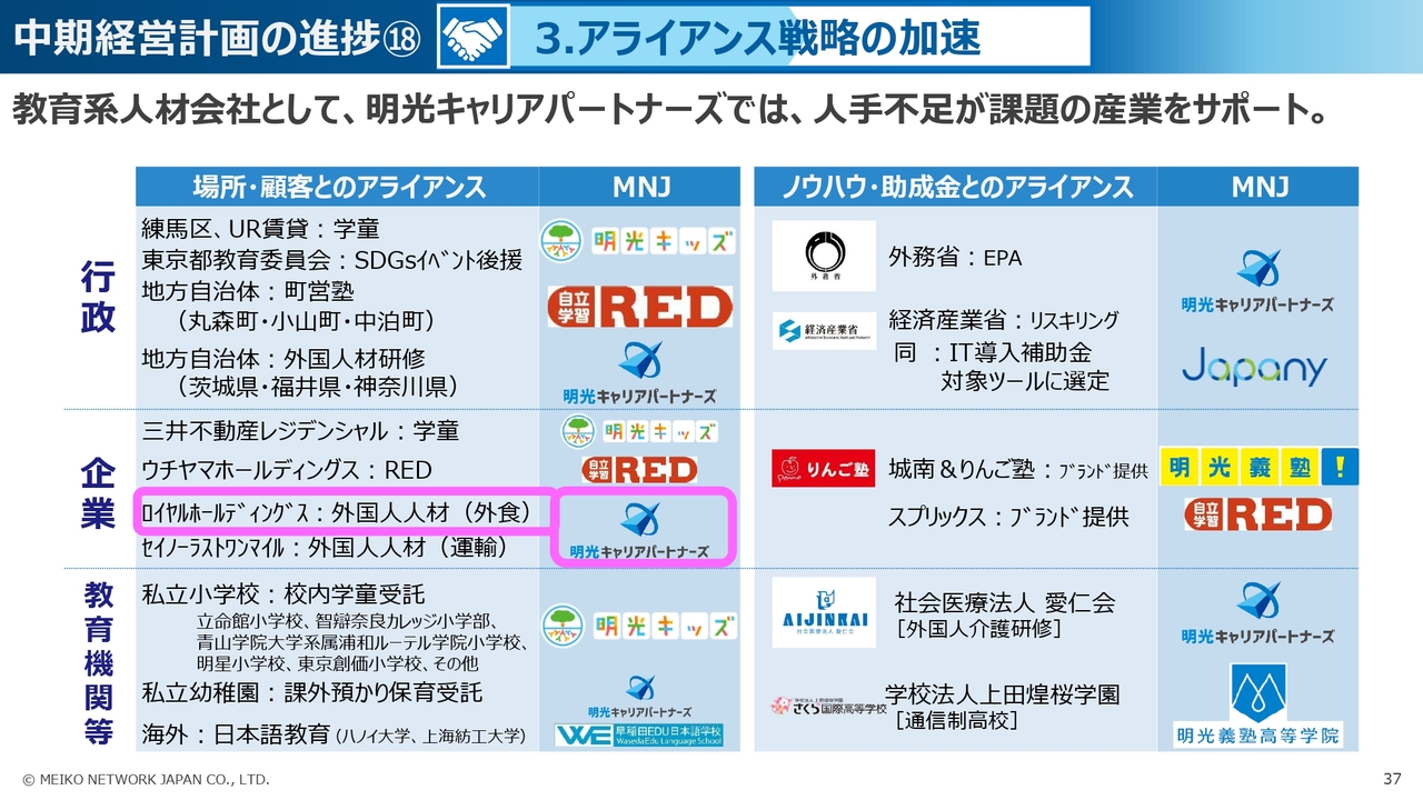 3つ目の「アライアンス戦略の加速」については、教育系の人材会社である明光キャリアパートナーズが、人手不足を課題とする業界との連携を強めています。