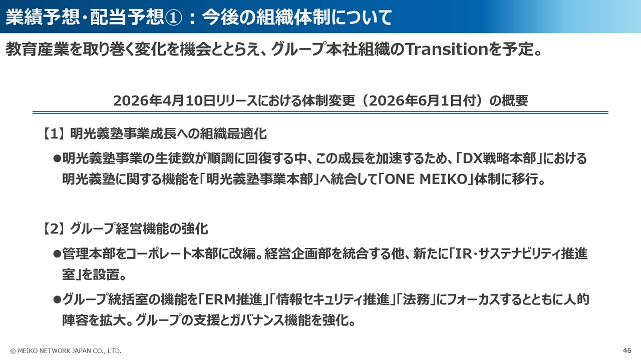 最後に、今後の組織体制に関する変更と、当期の業績予想・配当予想についてご説明します。