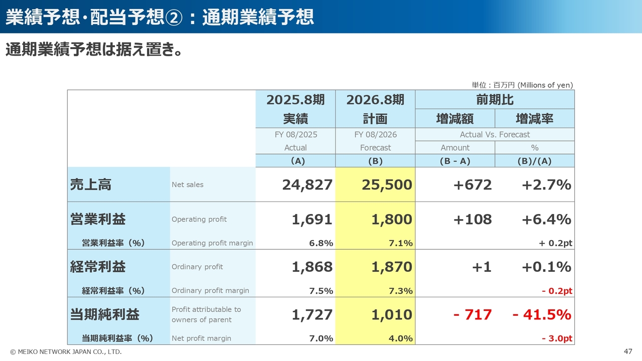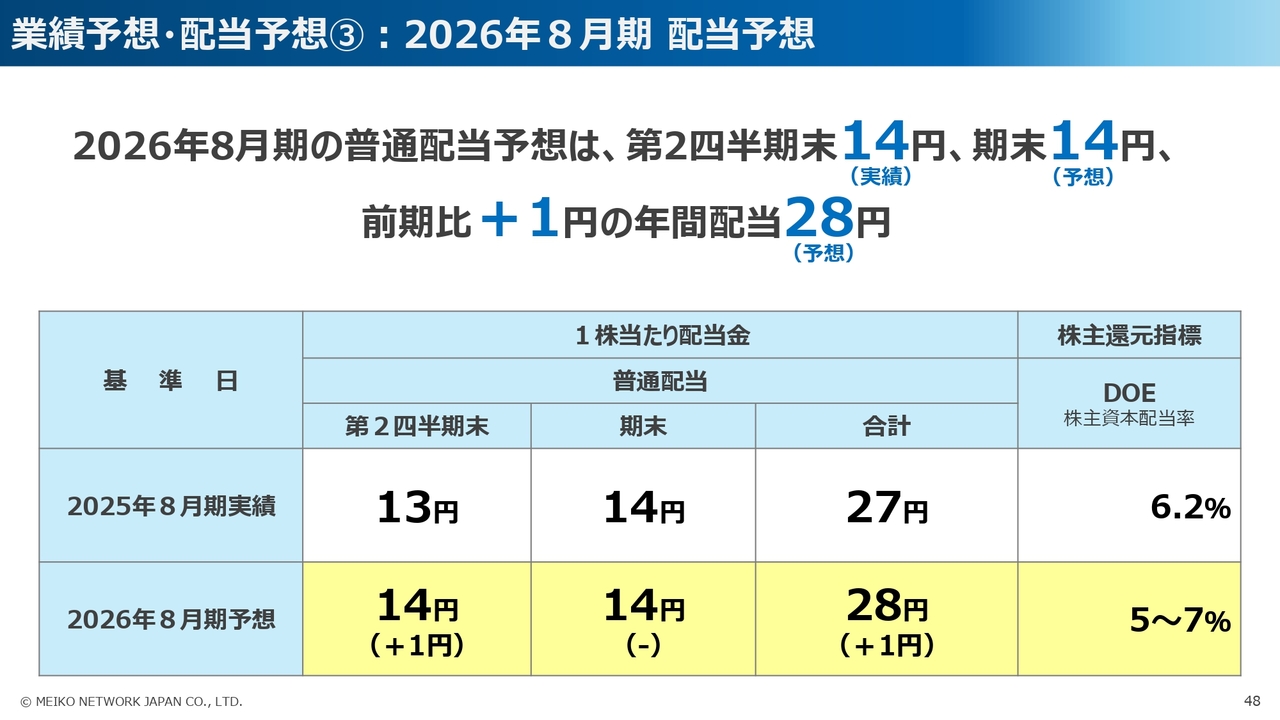 2026年8月期第2四半期末の配当は、計画どおり普通配当14円としました。期末の配当についても、計画どおり普通配当14円とし、年間配当は前期比プラス1円の合計28円とさせていただく予定です。