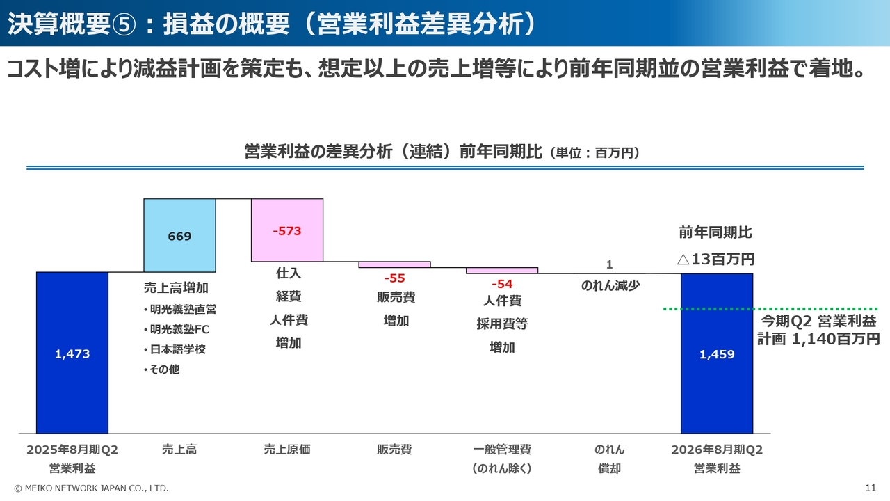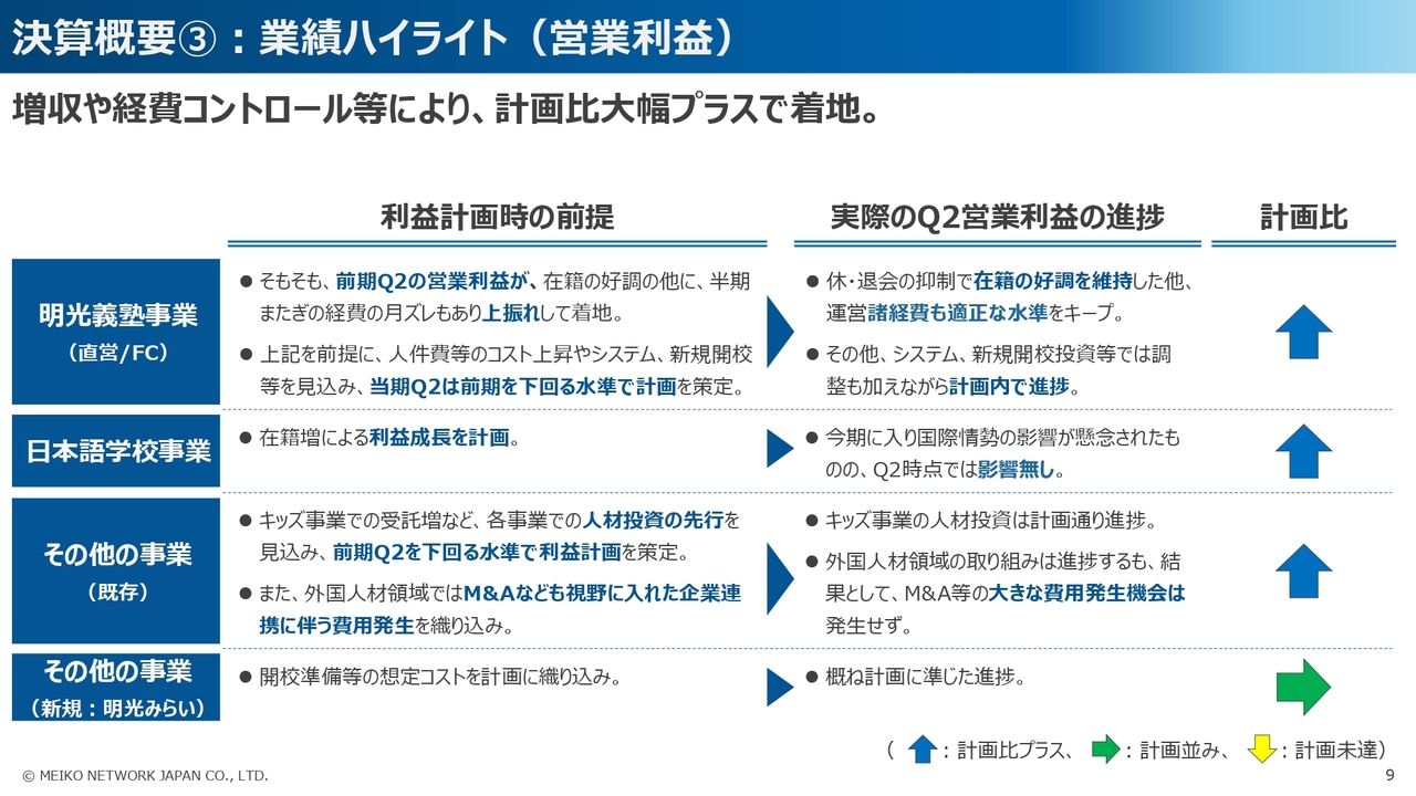 ベースアップによる人件費の増加や、情報システム、明光義塾の新規開校などの費用、また、新規事業の立ち上げに伴う費用などが発生し、前年同期比で減益を見込んでいましたが、売上の増加が想定を上回ったほか、経費のコントロールによる最適化をはかったことにより、おおむね前年同期並みの営業利益での着地となりました。