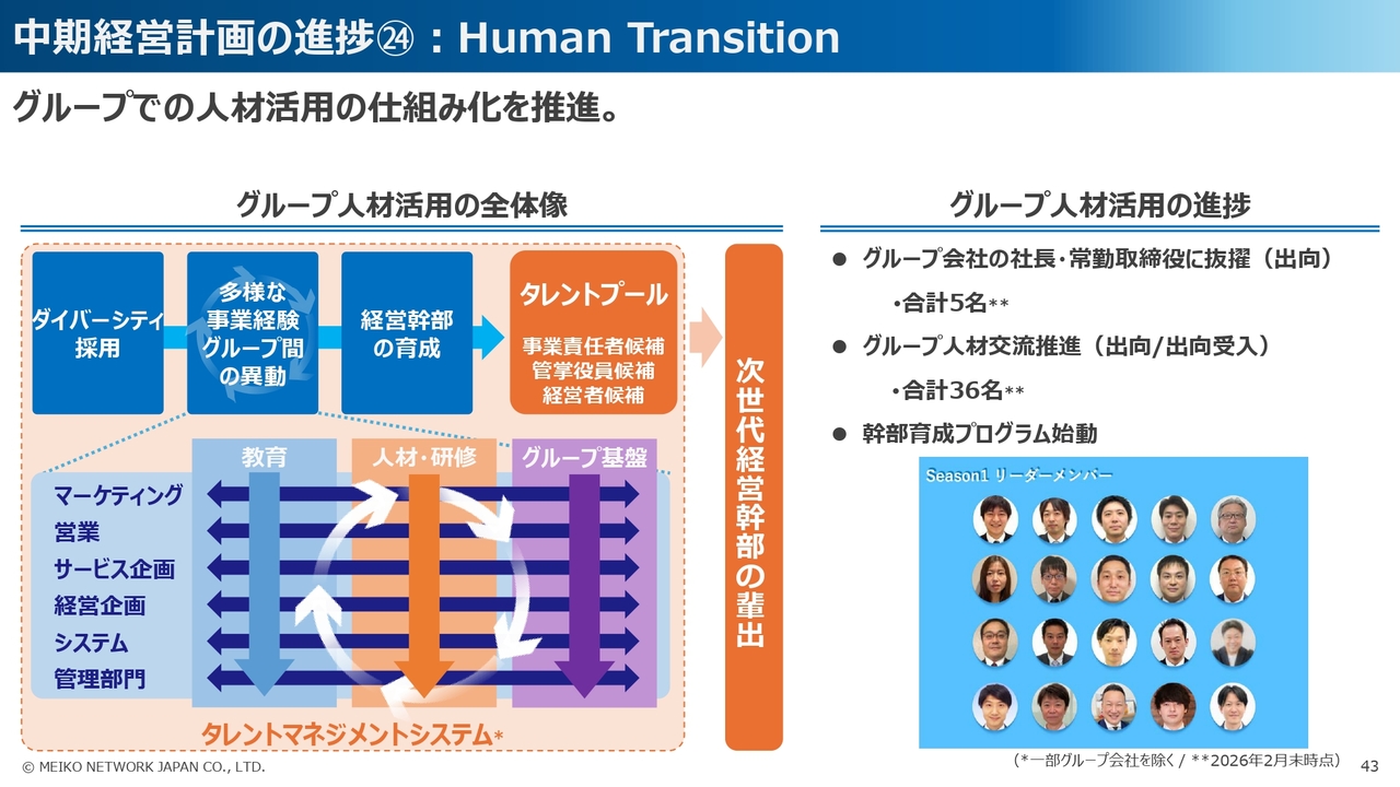 次に、「Human Transition」に関しては、ジョブローテーションによる多様な事業経験を通じた人材育成により、経営幹部人材の輩出に取り組んでいます。