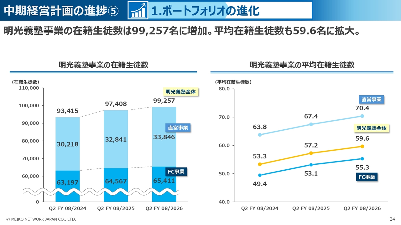 また、1教室あたりの平均在籍数についても、直営・FCでそれぞれ改善し、全体で59.6名にまで向上しており、運営効率の向上を通じて、教室の収益力改善も進みました。