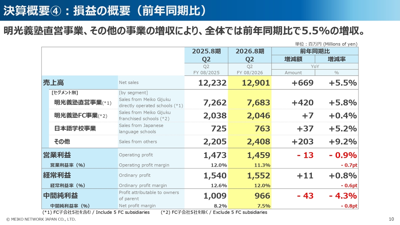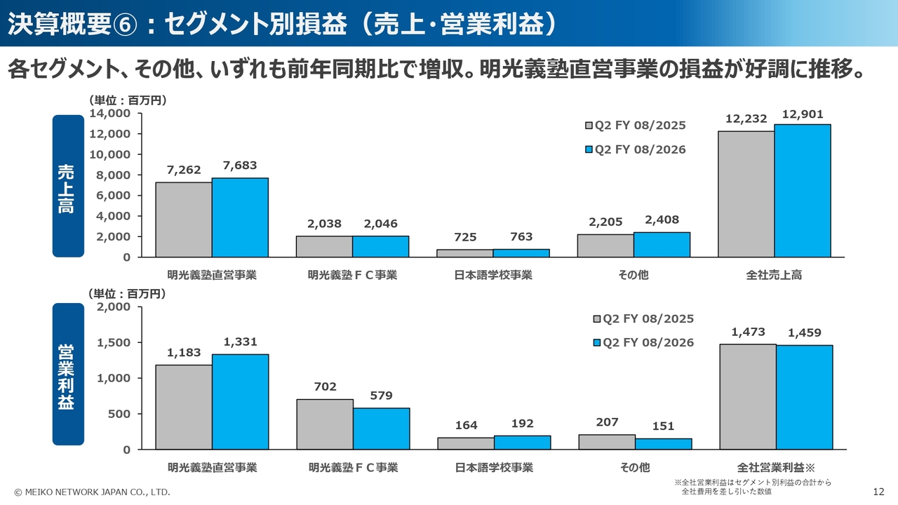 詳しくはセグメント別の中でご報告しますが、2026年8月期第2四半期の売上高については、明光義塾直営事業を中心として、おおむね想定どおりの進捗を見せたことで、計画を達成することができました。