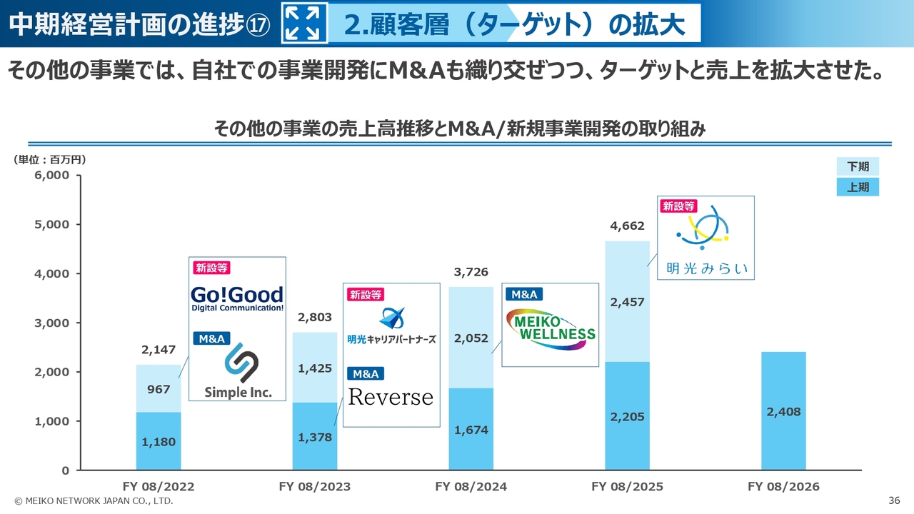 スライドは、その他の事業の近年の売上推移のグラフです。人材事業や明光みらいのような新規の事業開発に加えて、M&Aなども織り交ぜながら、顧客層の拡大を実現して、事業の成長を推し進めてきました。