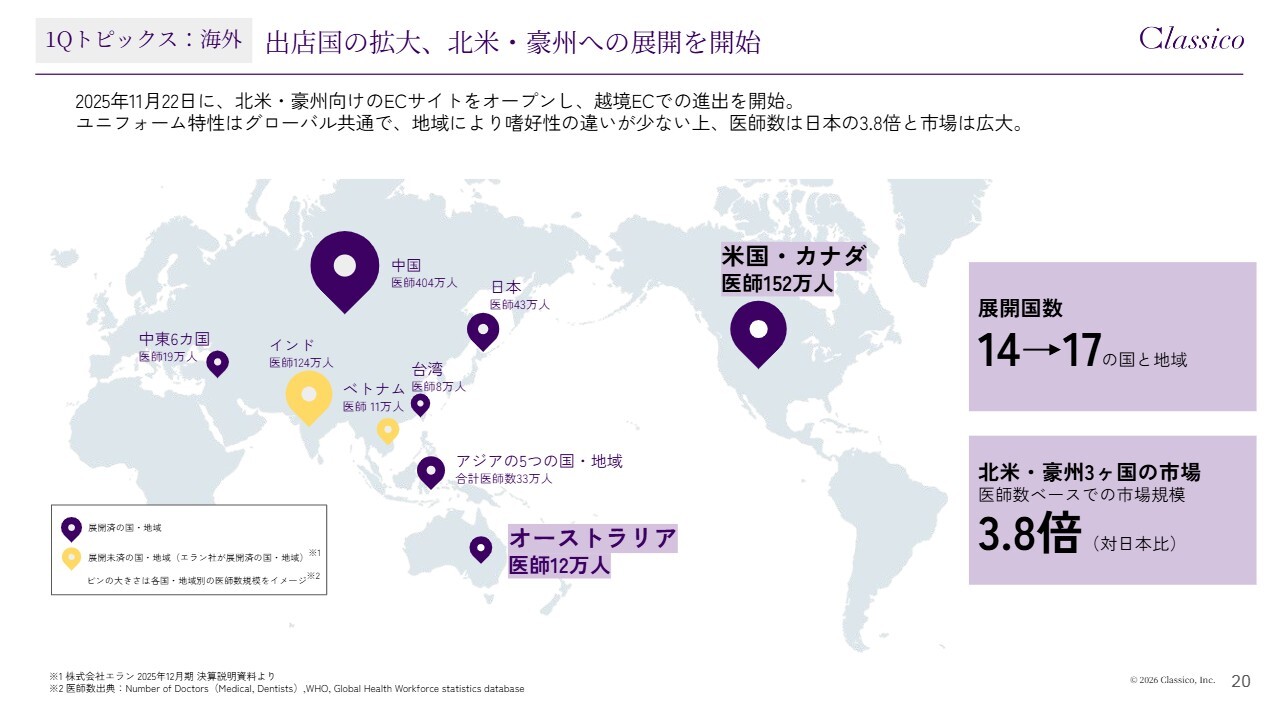 実際に2025年11月には、米国、カナダ、オーストラリアでの展開を開始し、展開国数は17の国と地域へと拡大しました。これらの市場は、ドクターの数だけでも日本の3.8倍の規模を誇り、今後この広大な市場に向けて、さらに商品を提供していきたいと考えています。