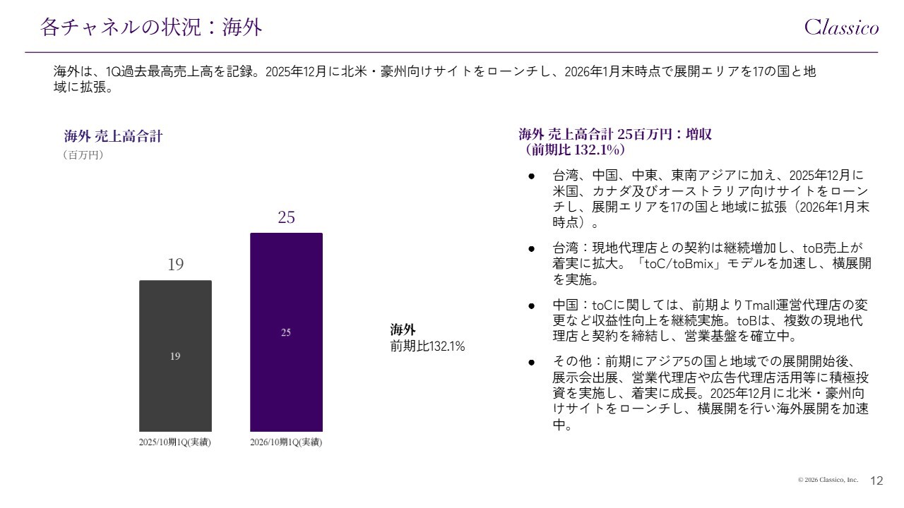 海外チャネルです。売上高は2,500万円で、前期比132.1パーセントとなり、第1四半期では過去最高の売上を更新しました。