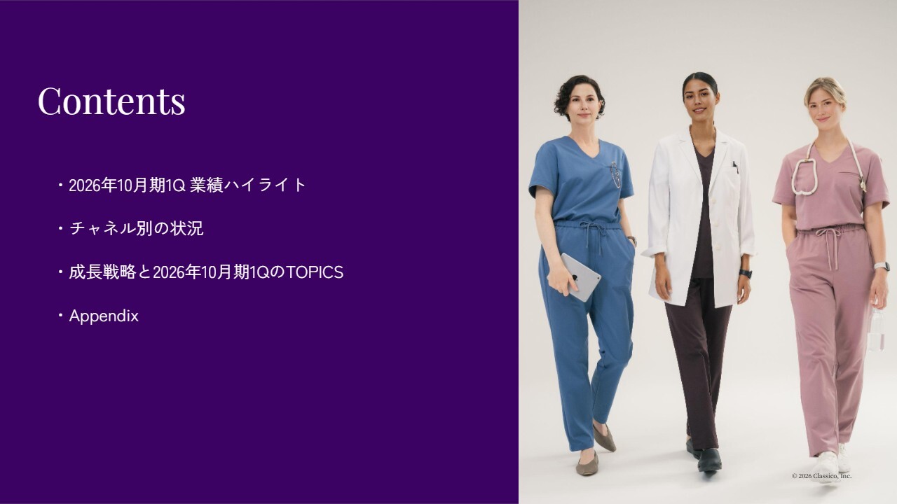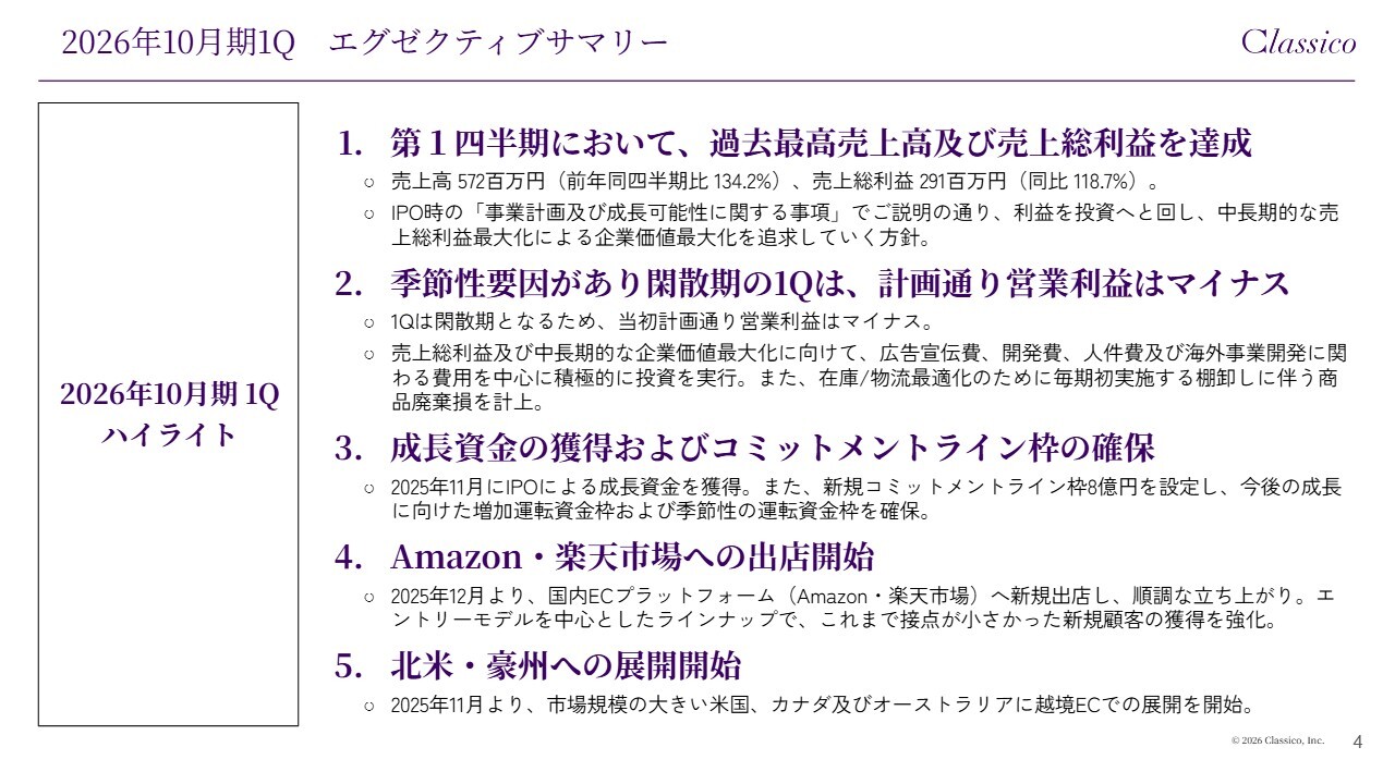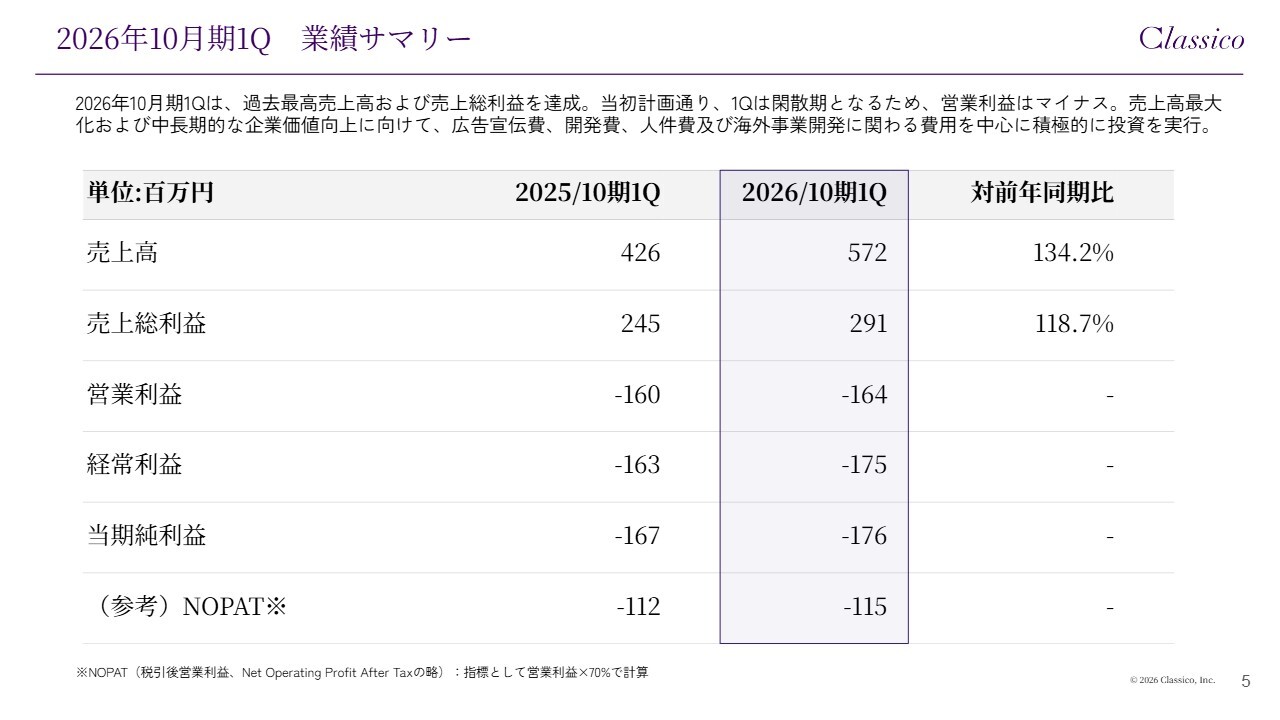 大和新氏:こんにちは。クラシコ株式会社代表取締役CEOの大和です。本日は2026年10月期第1四半期決算説明会にご参加いただき、ありがとうございます。