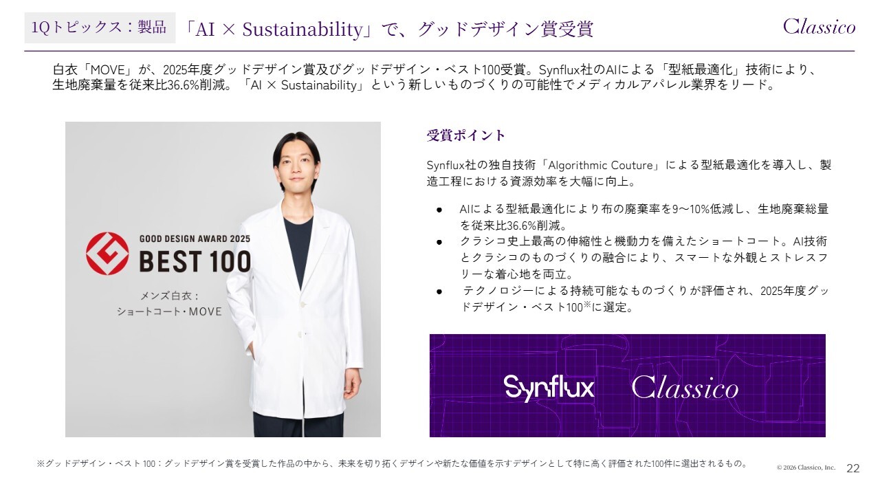 最後に、製品面でのトピックスです。白衣「MOVE」が「AI × Sustainability」として、2025年度グッドデザイン賞およびグッドデザイン・ベスト100を受賞しました。